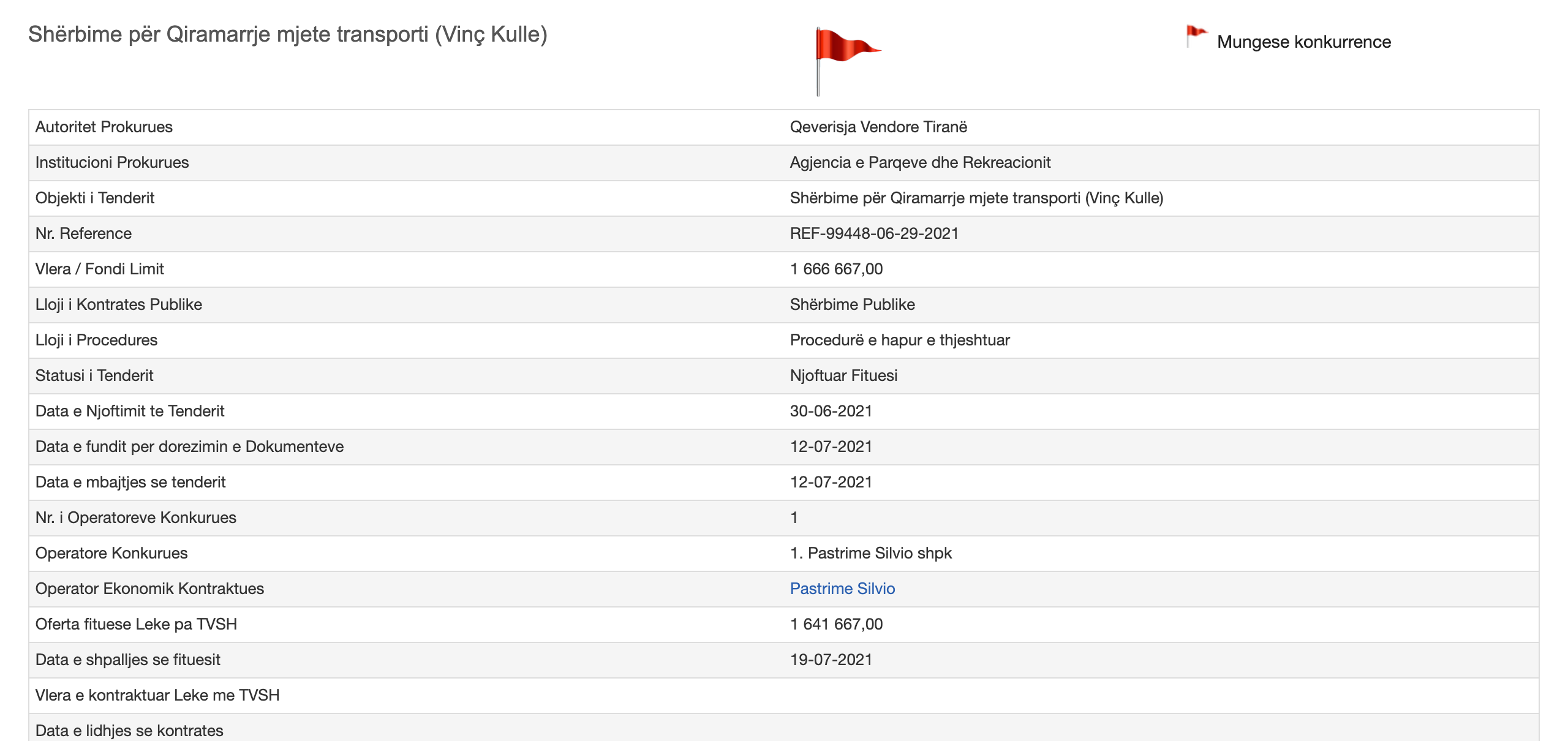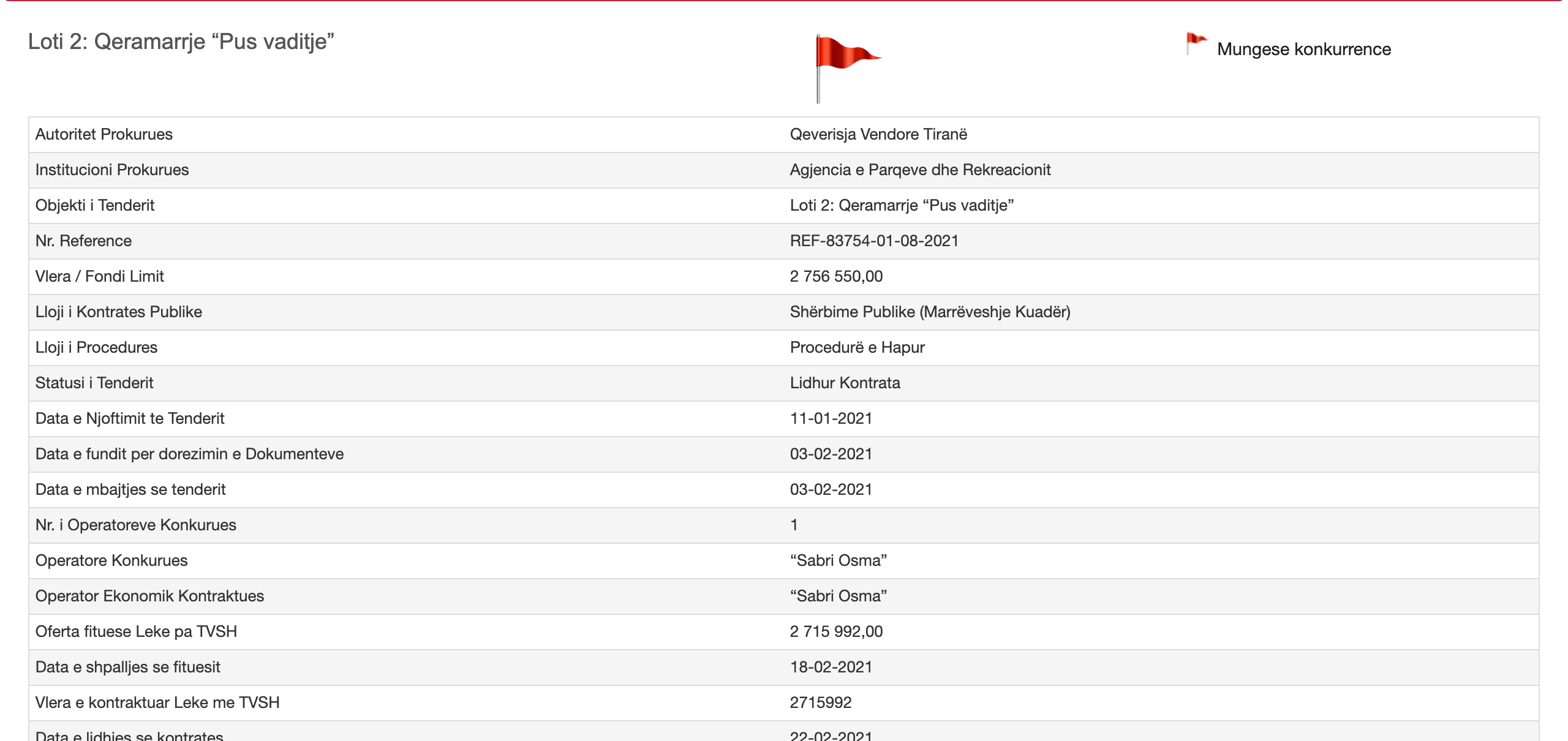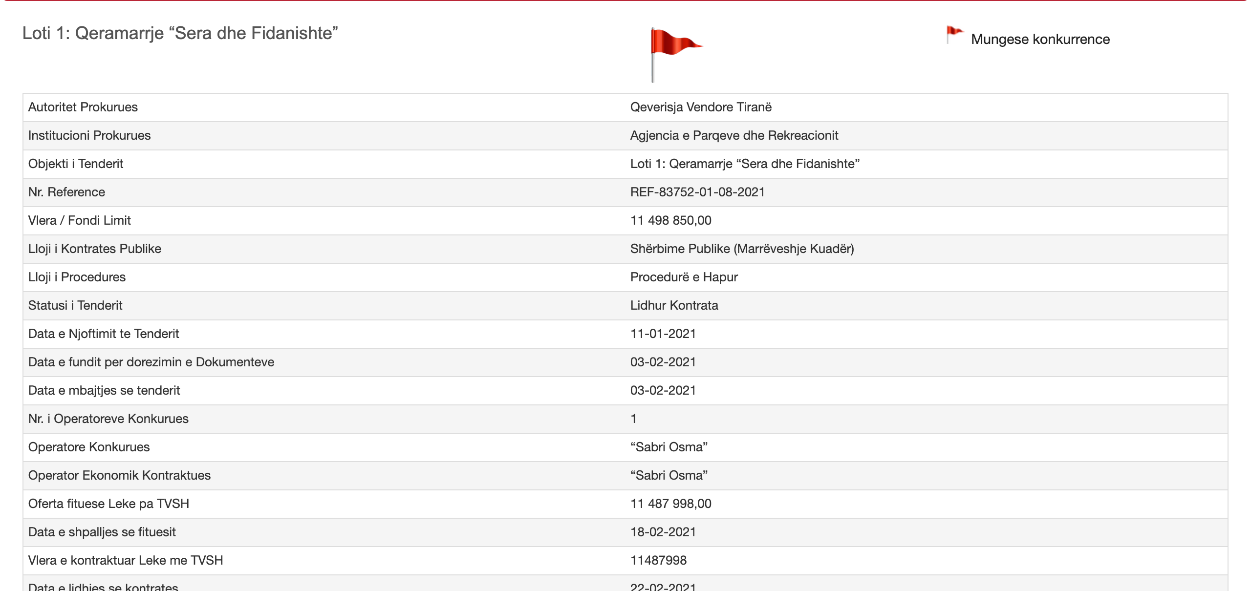 Këto tendera janë klasifikuar me flamur të kuq për dy arsye, “Mungesë konkurrence” dhe “Skualifikim i të gjithë operatorëve konkurrues veç fituesit”.