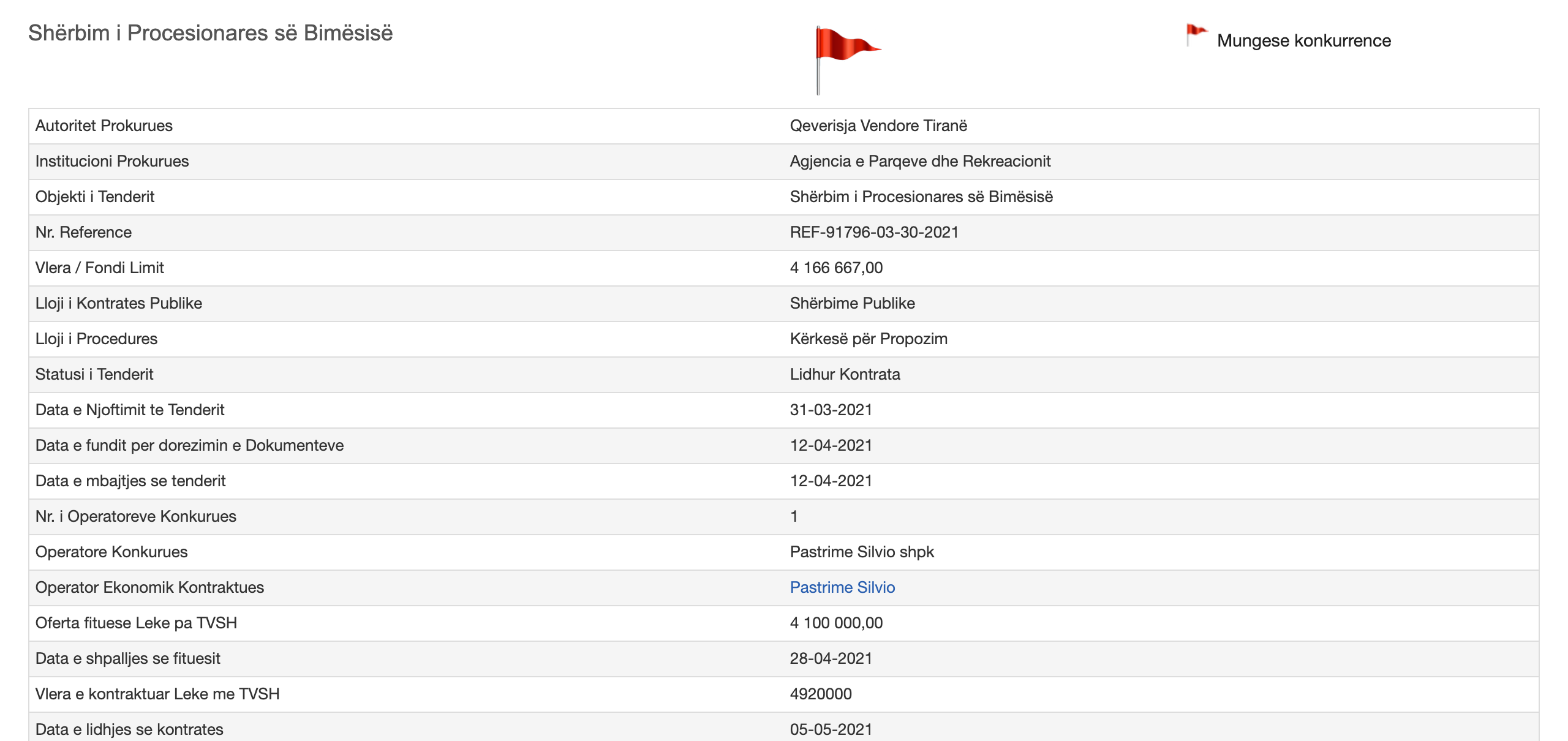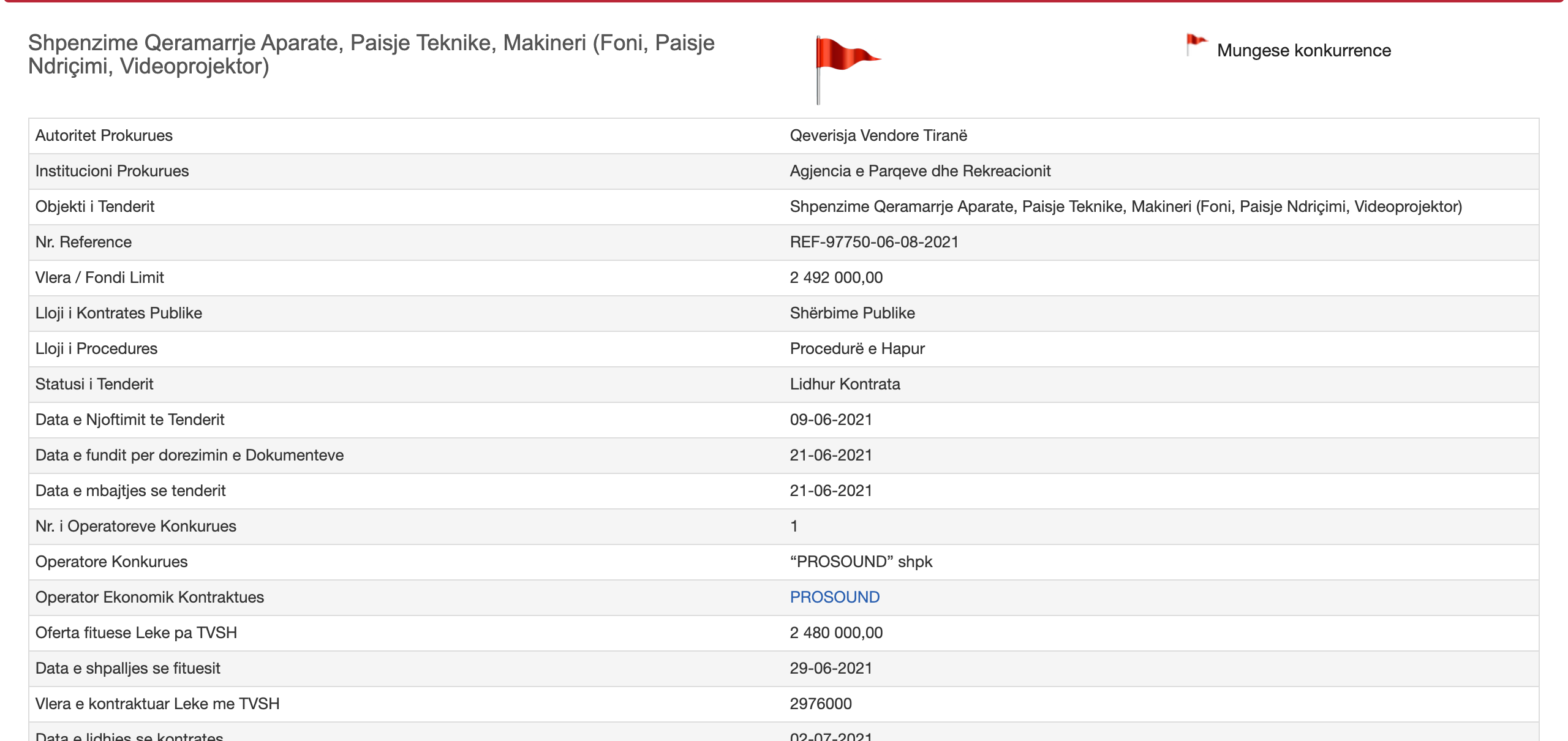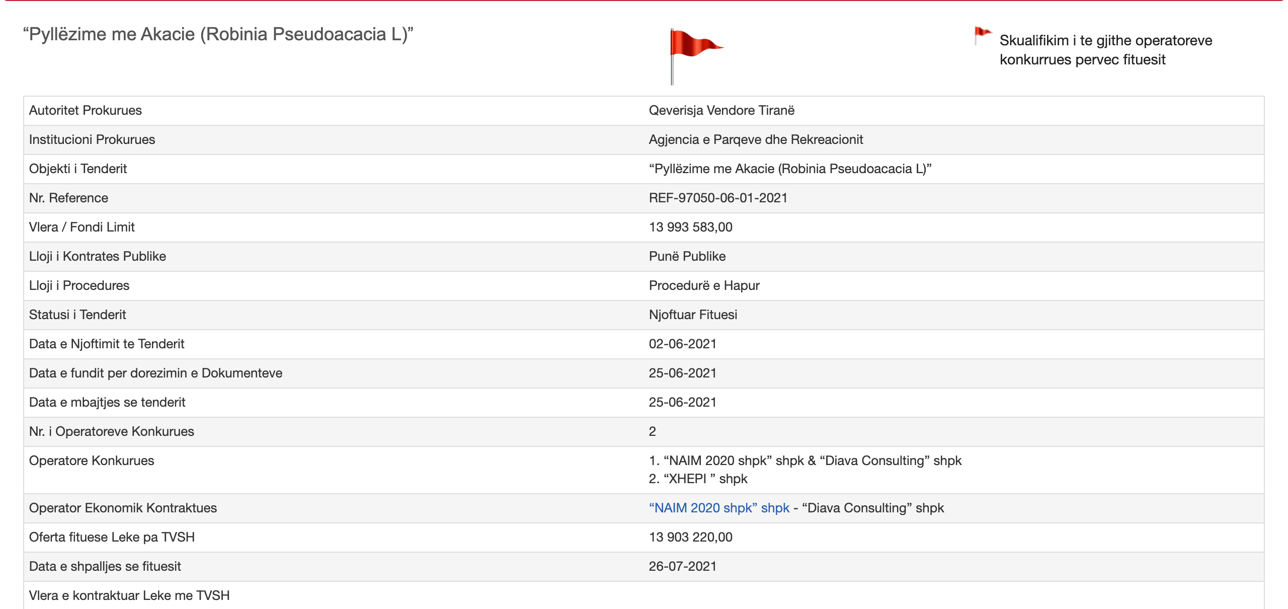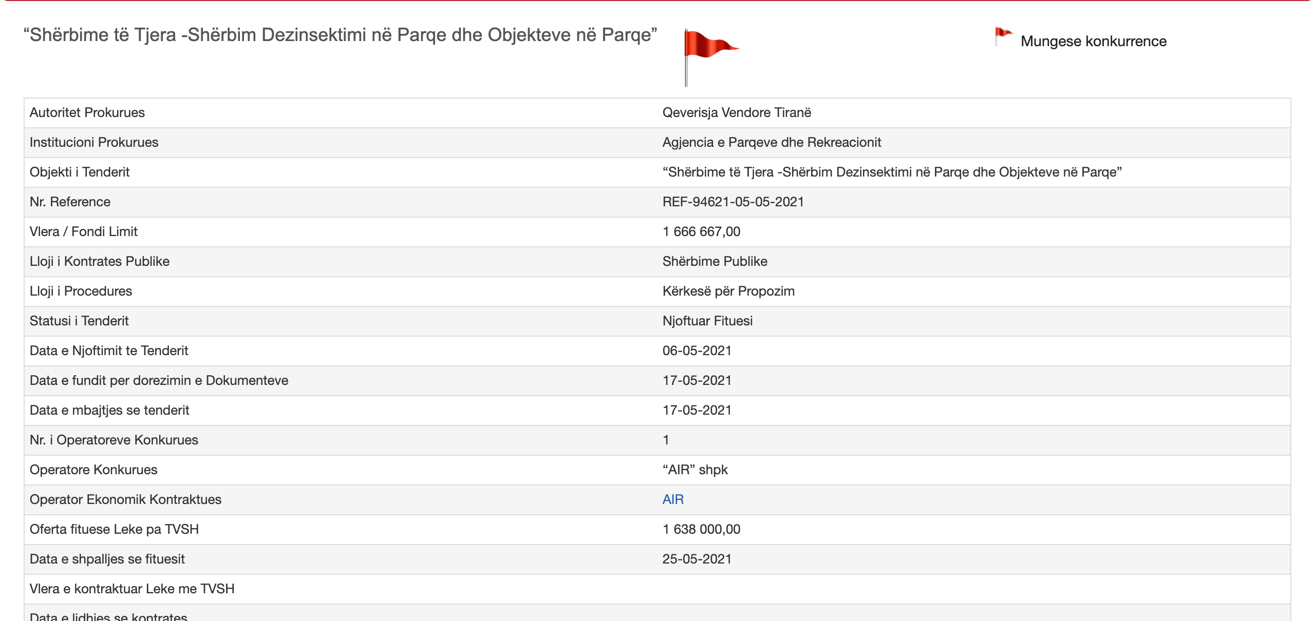 Këto tendera janë klasifikuar me flamur të kuq për dy arsye, “Mungesë konkurrence” dhe “Skualifikim i të gjithë operatorëve konkurrues veç fituesit”.