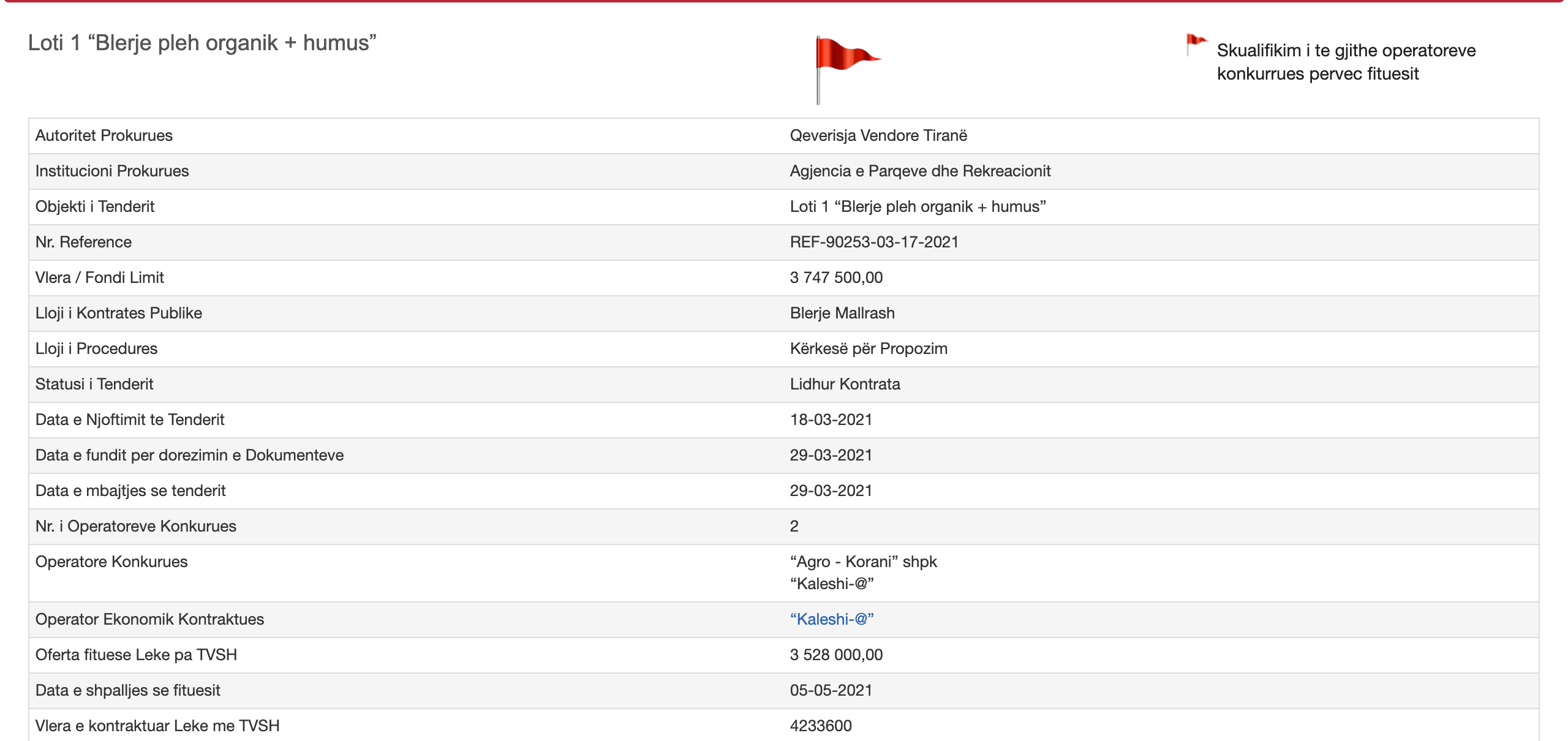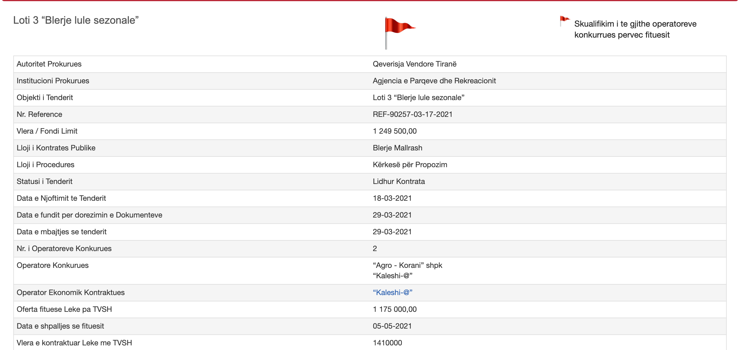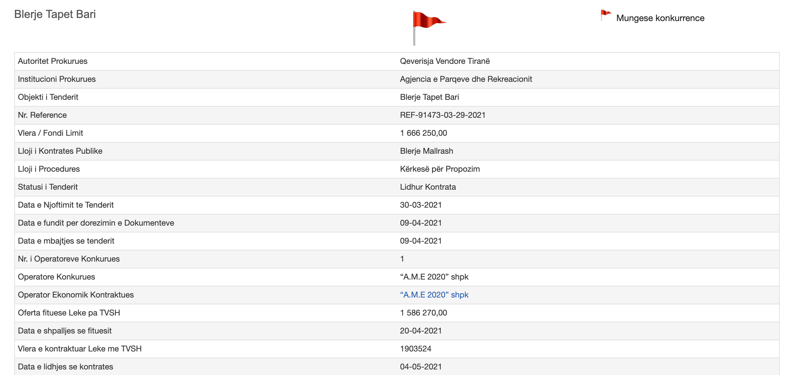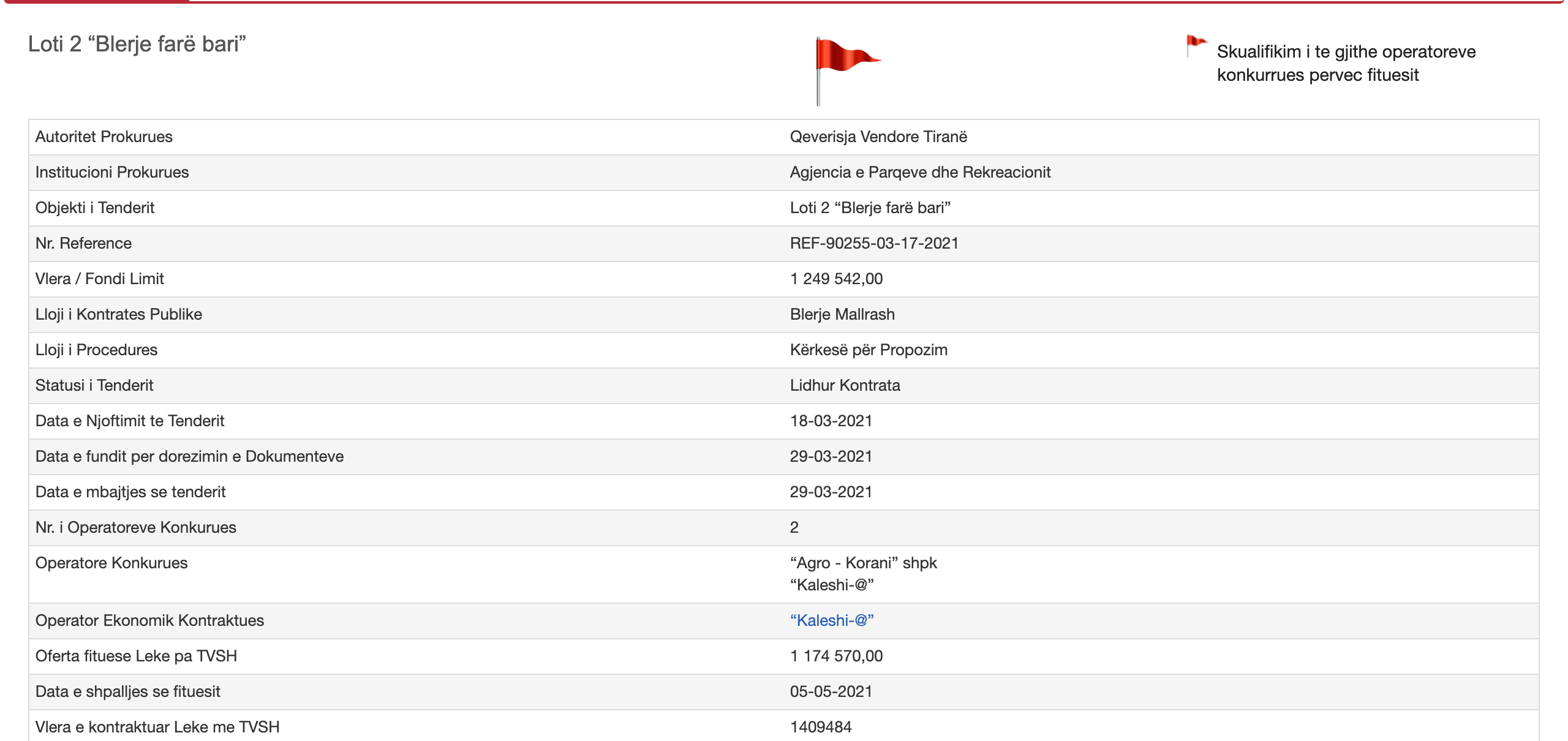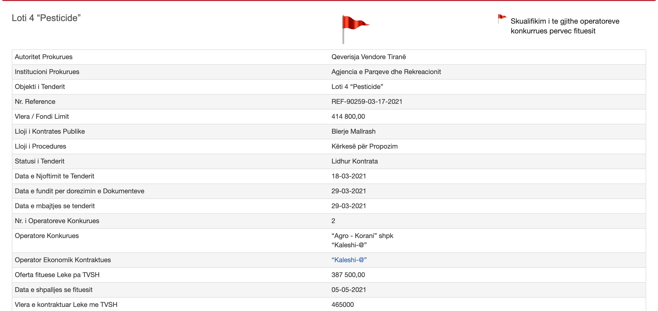 Të gjitha këto tendera janë raportuar me “red flag” (flamur të kuq), që nënkupton se prokurimi ka një ekspozim apo rrezik për sjellje të papajtueshme me ligjin, kryesisht në lidhje me mos zbatimin e ligjeve antikorrupsion.