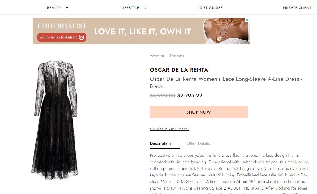 Fustani është i markës ‘Oscar de la Renta’ dhe është kapur me ofertë nga gruaja e kryebashkiakut të Tiranës, e cila sipas çmimit që mban fustani në faqen zyrtare, ka paguar 2 mijë e 759 dollarë.