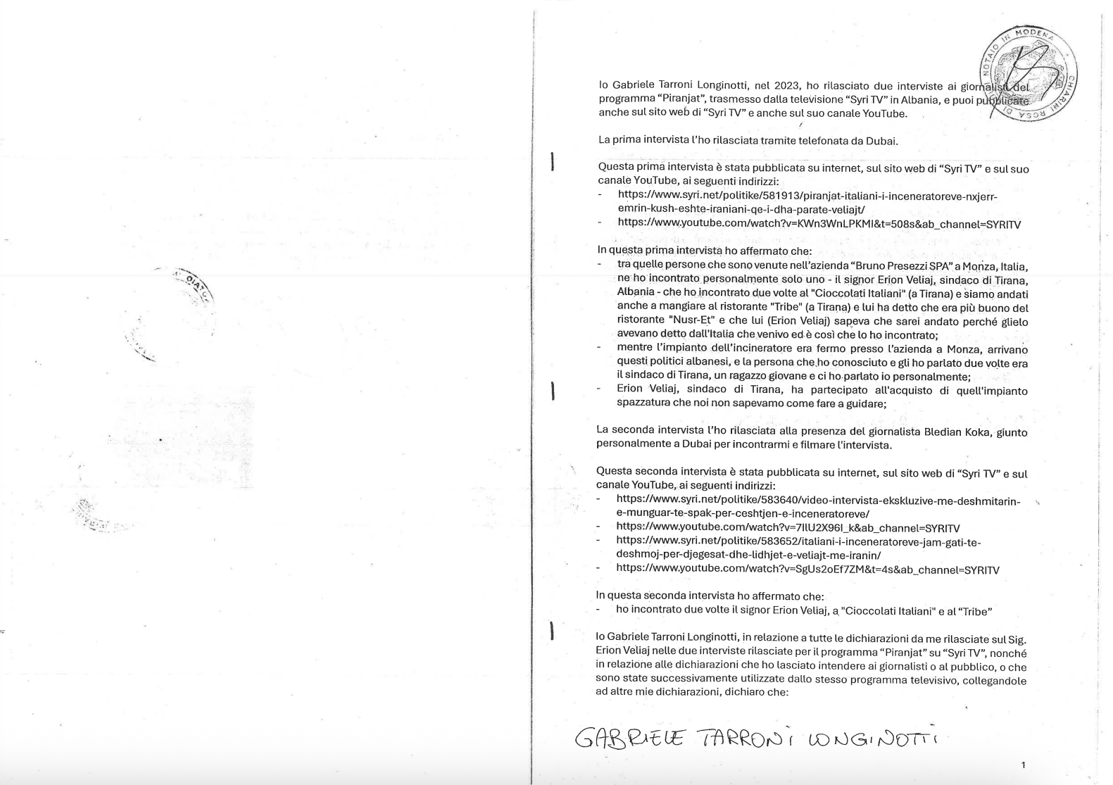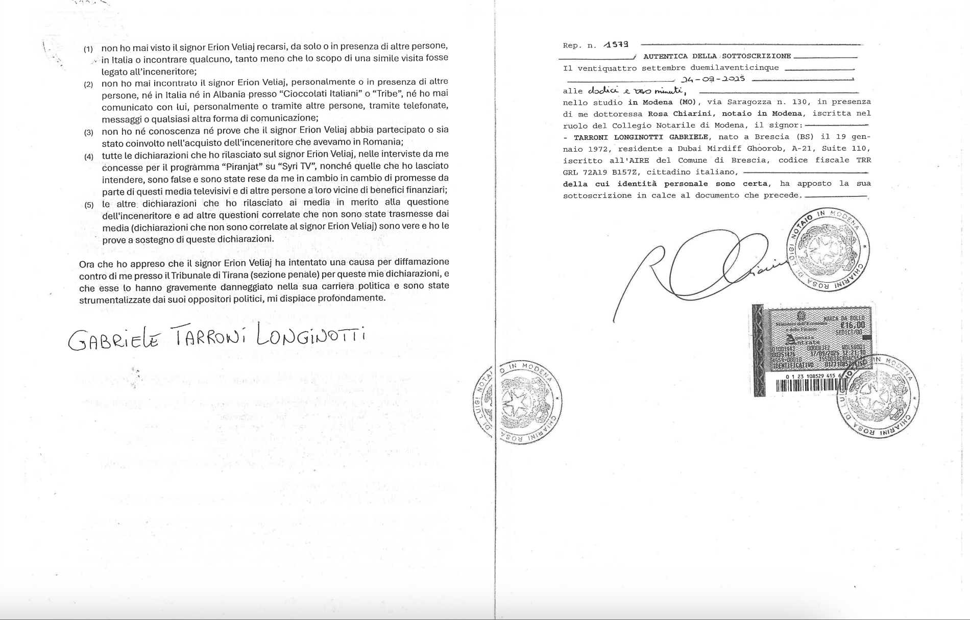 Avokatët e Veliajt depozituan të hënën një deklaratë noteriale të datës 24 shtator 2025, të nënshkruar në Modena para noteres Rosa Chiarini, ku vetë Gabriele Tarroni Longinotti hedh poshtë çdo akuzë që kishte artikuluar ai dy vite më parë. “Gjithçka ishte shpifje për para”, – deklaron Longinotti dhe pas dëshmisë së rremë të transmetuar në emisionin “Piranjat” nisën edhe protestat 2-vjeçare para Bashkisë së Tiranës.