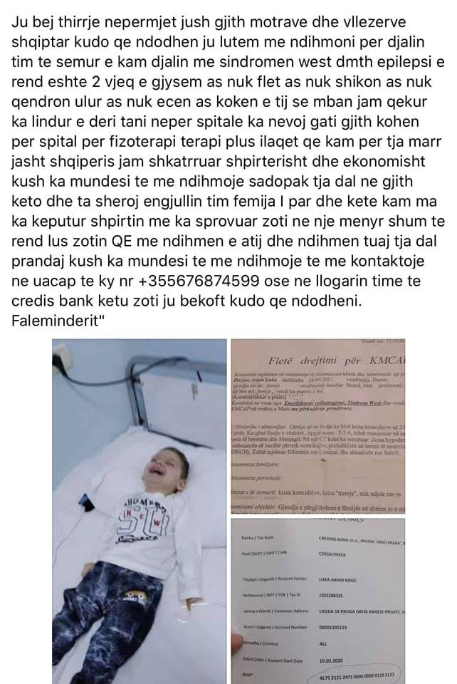 Një baba i dëshpëruar për t’i ardhur në ndihmë djalit të tij të mitur, i cili vuan nga Sindroma West, ose më saktë epilepsi e rëndë, ka bërë një apel për ndihmë për të siguruar disa të ardhura për t’i përmirësuar sadopak gjendjen e tij shëndetësore.