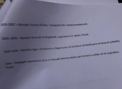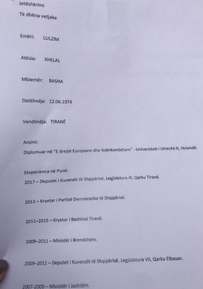 Kreu i grupit Parlamentar të PS-së, Taulant Balla ka nxjerrë një dokument të Lulzim Bashës që ia ka dorëzuar Kuvendit kur u bë deputet që ka deklaruar vetë që ka qenë përgjegjës operacional i zyrës së Gjykatës ndërkombëtare për krime lufte.