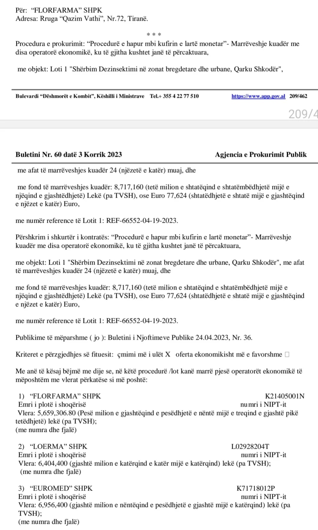 Tre nga katër tenderat e ndjekur nga Endri Mullai për mushkonjat i ka fituar kompania Florfarma e familjes Todhe, në vlerat mbi 300 mijë euro. Një tender e kanë fituar Armand Fida dhe Fatos Lashi.