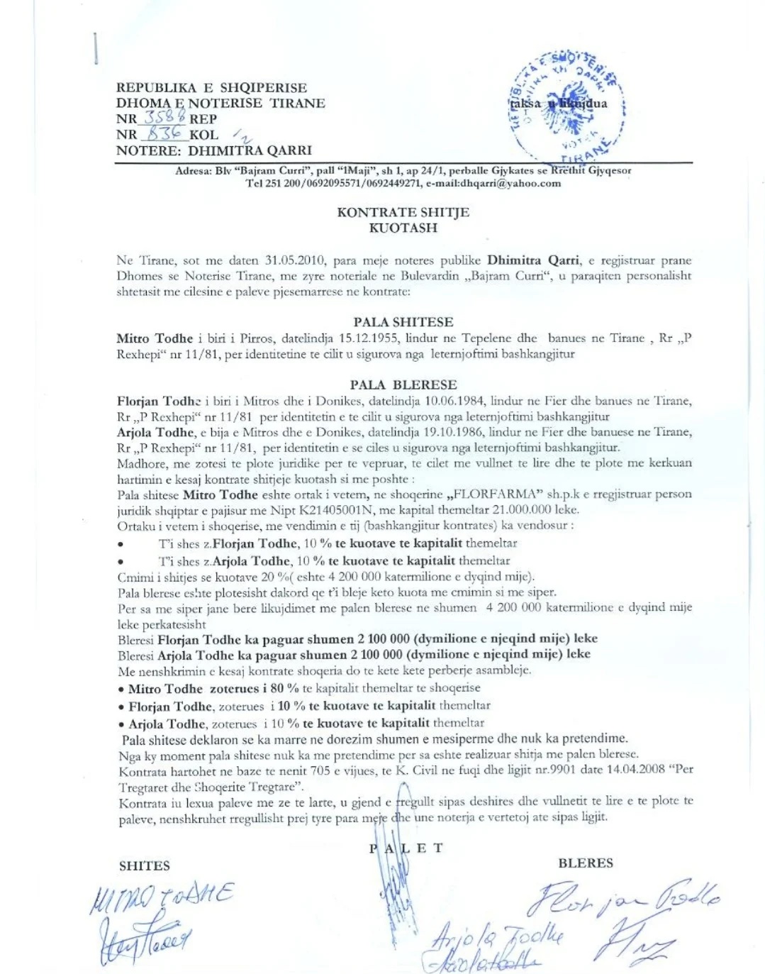 I lakuar në media si ish berberi i Gramoz Ruçit, Mitro Todhe qëndron pas kompanisë farmaceotike Florfarma (K21405001N), të cilën e ka kaluar formalisht në emrin e fëmijëve Florjan dhe Arjola Todhe që në vitin 2010.