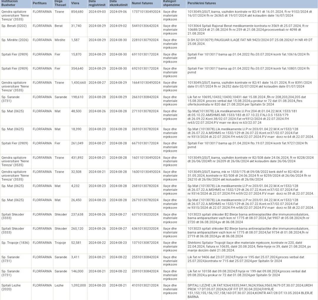 Kompania Florfarma rreth 60 tendera i ka marrë nga QSUT, 60 tendera nga Spitali i Traumës, mbi 90 tendera nga Spitali i Fierit, mbi 80 tendera nga Spitali i Elbasanit etj.