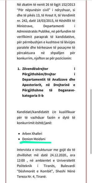 Këto ditë që po kalon papunësinë e katërt të rradhës, djalit të Rexhep Meidanit qeveria i hap derën përsëri dhe siç e shikoni në foton e parë ilustruese, Denion Meidani rikthehet në Doganat Shqiptare në pozicionin e Zëvendës Drejtorit të Përgjithshëm ku në emër të qeverisë do mbledhë taksat e akcizave për hyrje-daljet e karburanteve, gazrave, alkoolit.