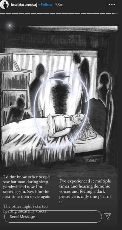 “Nuk e di nëse njerëzit e tjerë kanë parë burrin me kapele gjatë paralizës së gjumit, por tani jam sërish e frikësuar. E pashë një herë në fillim dhe kurrë më. Mbrëmjen tjetër nisa të dëgjoja zëra jo tokësor. E kam përjetuar disa herë dhe dëgjimi i zërave djallëzorë dhe ndjenja e një pranie të errët është vetëm një pjesë e saj”-ka rrëfyer Beatrix Ramosaj.