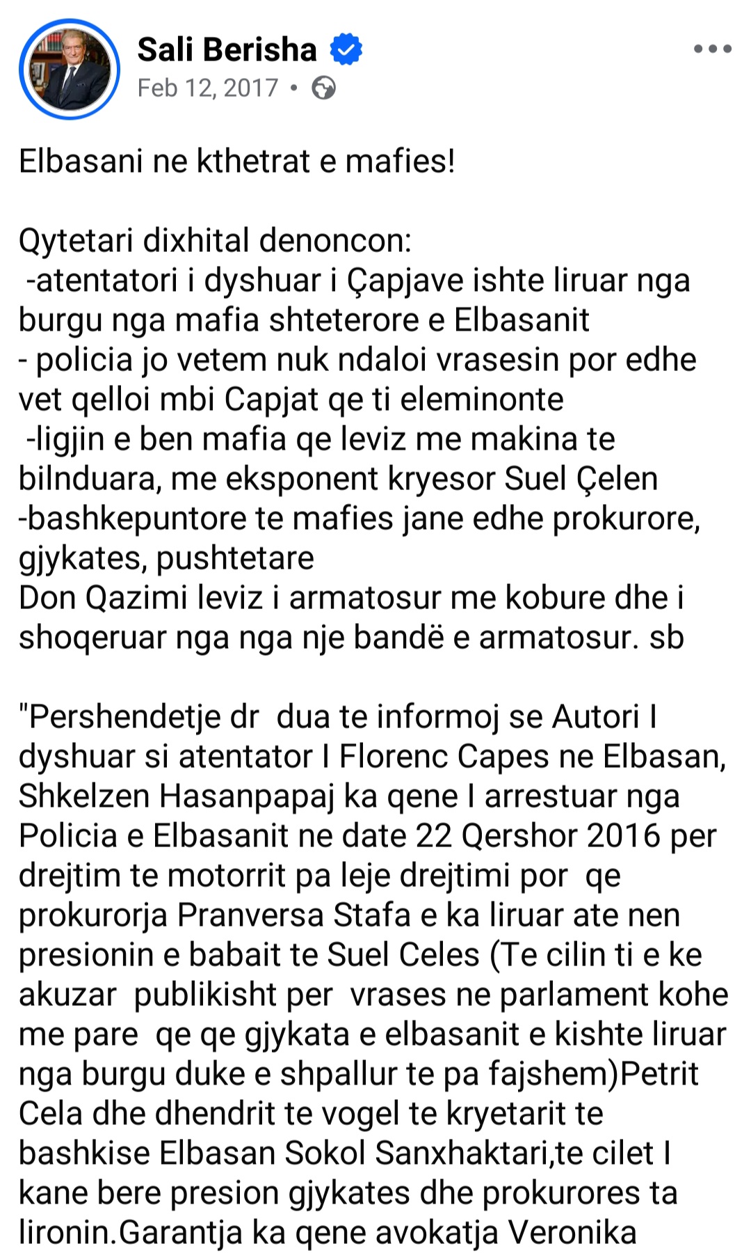 Bëhet fjalë për Klodiana Çapja, lidhje e fortë familjare e grupit kriminal Çapja, i cili jo rastësisht është mbrojtur publikisht nga Sali Berisha për vite me radhë, përmes Qytetarit Dixhital. Ashtu siç nxiti vrasjet seriale në Tropojë, Sali Berisha i ka fryrë zjarrit të konfliktit mes grupeve në Elbasan, duke marrë në mbrojtje grupin kriminal Çapja, që akuzohet nga drejtësia për një sagë vrasjesh.