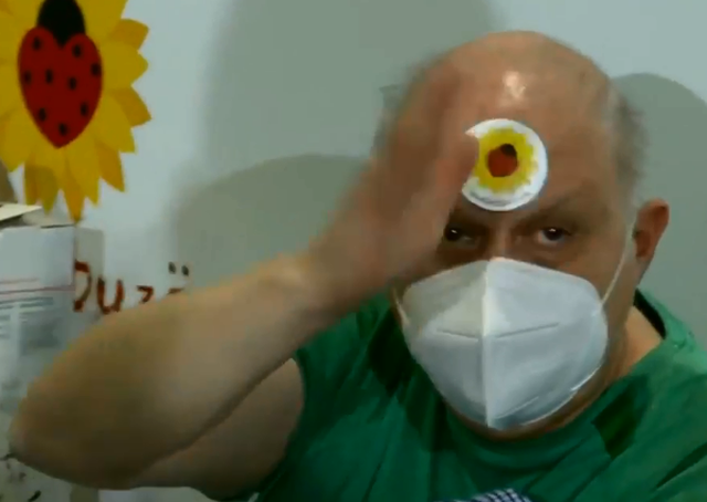 Mjeku Tritan Kalo Në fund të injektimit të vaksinës Kalo ka ngjitur në ballë, logon e fushatës së vaksinimit anti-Covid Në Shqipëri.