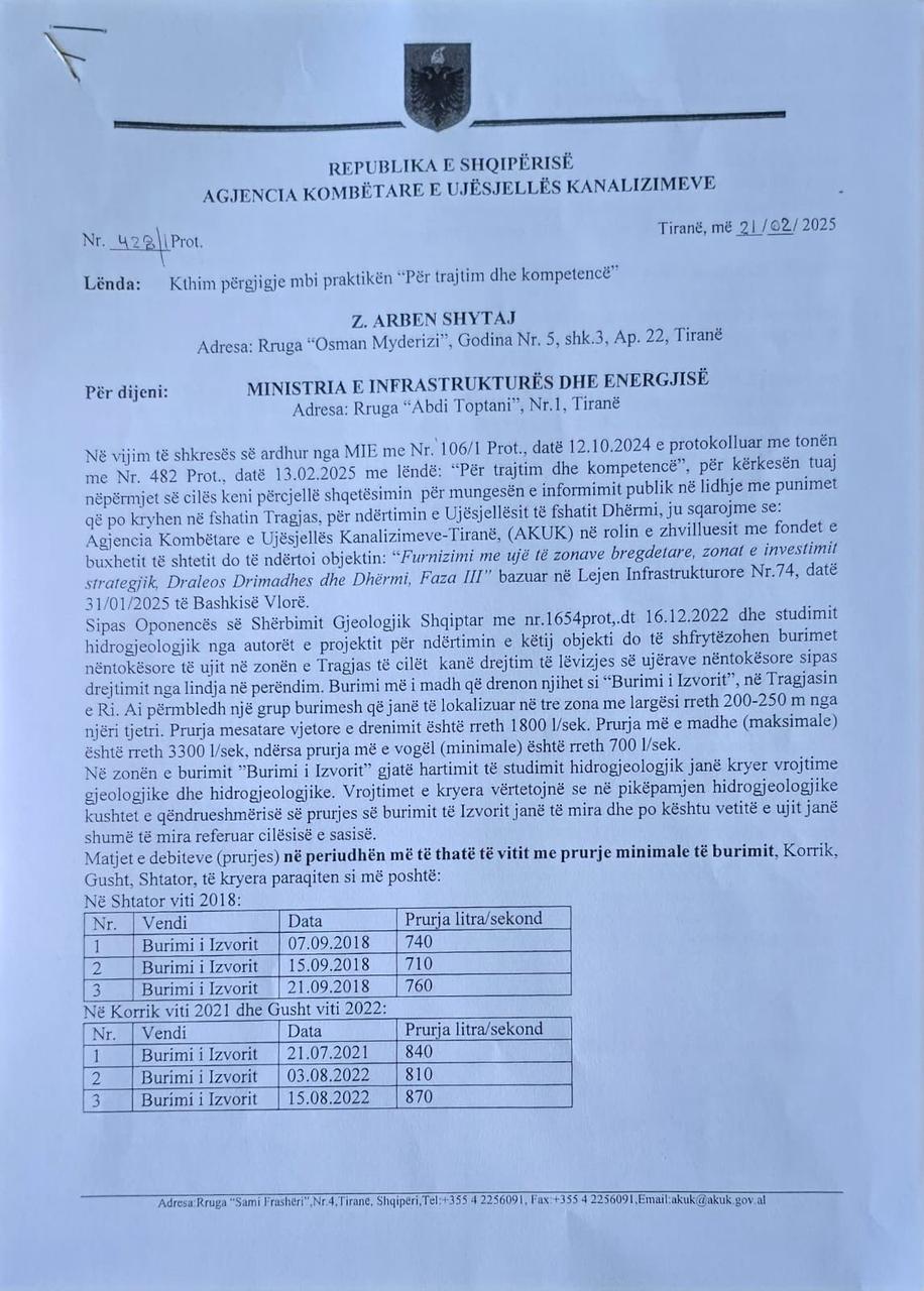 Në media është publikuar dhe një dokument i plotë për projektin e ujësjellësit të Tragjasit. Sipas dokumentit të lëshuar nga Agjencia Kombëtare e Ujësjellës Kanalizimeve, vetë burimi i ujit nga viti 2018 deri në vitin 2022 është rritur nga 740 litra në sekondë në 870 litra në sekondë. Analizat konkrete kundërshtojnë atë çfarë u është thënë banorëve deri më tani, që uji i burimit është në rënie.