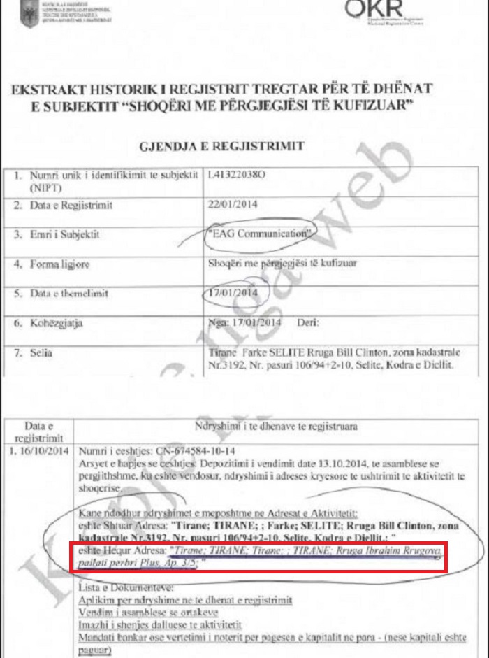 Një nga gjurmët që u ndoqën atëherë nga mediat, ishte gafa e rëndë e kompanisë “EAG-Communication” me vendosjen e adresës së saj, e cila korrispondonte kryekëput me kompaninë “Gogel” të Arbi Veliajt, vëllait të kryebashkiakut Erion Veliaj.