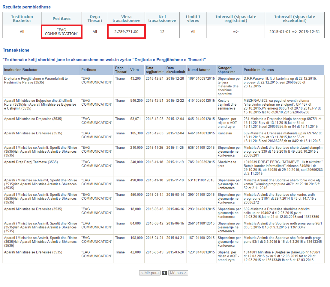 Si për të mos rënë në sy, “EAG Communication” e vazhdoj aktivitetin e saj edhe për vitin 2015, ku arriti të siguroj vetëm 27 milion lekë nga shteti, por duke mos arritur të marrë më asnjë projekt të rëndësishëm si ai i vizitës së Papa Françeskut në Tiranë. Nga lëvizjet e kompanisë, duket sikur “EAG Communication” u krijua vetëm për organizimin e pritjes së Atit të Shenjtë në Tiranë.