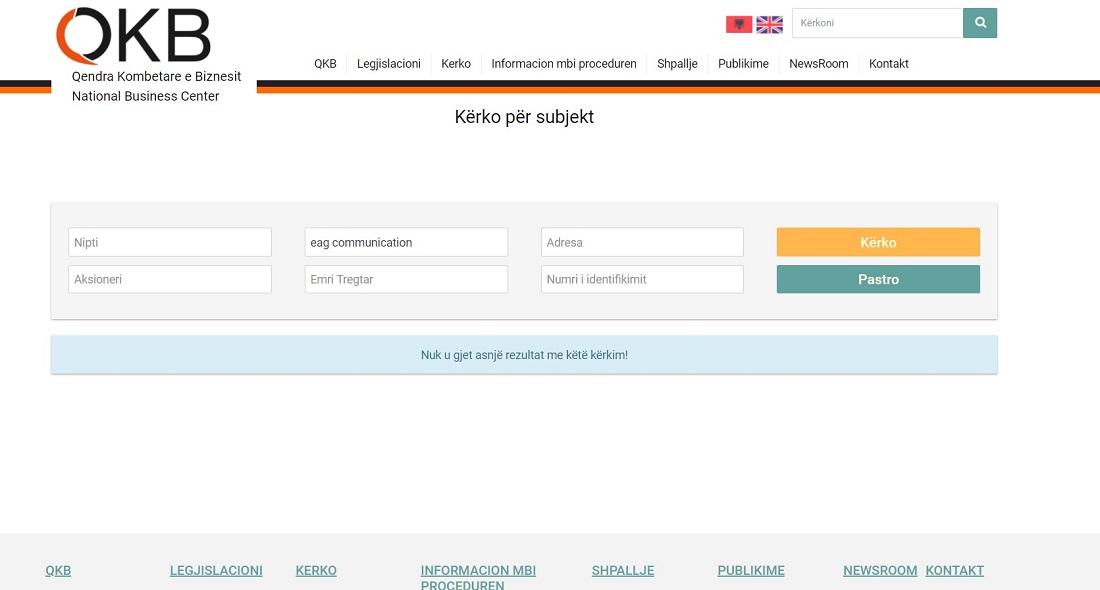 Rezultatet e kërkimit në Qendrën Kombëtare të Biznesit për kompaninë “EAG Communication”