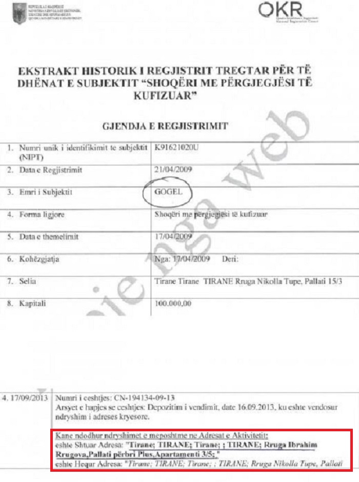 Pra fituesi i tenderit 394 milion lekë, ishte në adresën e vëllait të kryebashkiakut të Tiranës, pra: “Rruga Ibrahim Rugova, pallati përbri Plus, AP 3/5 Tiranë.”