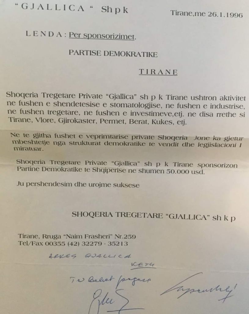 Shoqëria tregtare Private “Gjallica” shpk Tiranë sponsorizon Partinë Demokratike të Shqipërisë në shumën 50 000 USD. Ju përshëndesim dhe ju urojmë suksese”, shkruhet mes të tjerave në dokumentin që shoqëronte këtë sposorizim, të përcjellë me firmë dhe vulë.