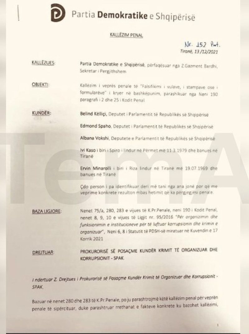 Ndërkohë që Gazment Bardhi mohon kallëzimin e tij datë 13.12.2021 me numër protokolli 152 kundër Belind Këlliçit, Edmond Spahos, Ivi Kasos, Albana Vokshit dhe Ervin Minarollit apo çdo personi të paidentifikuar nga ana jonë por që me veprimet konkrete rezulton oërgjegjës pikërisht për Kuvendin e Rithemelimit më 11 dhjetor 2021.