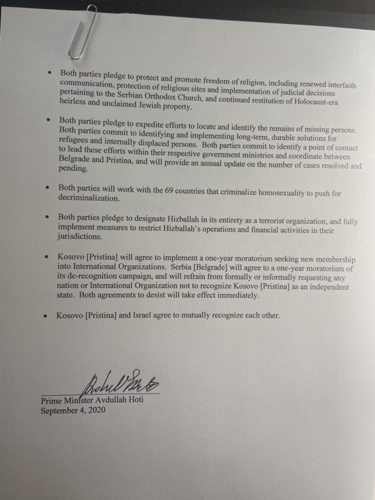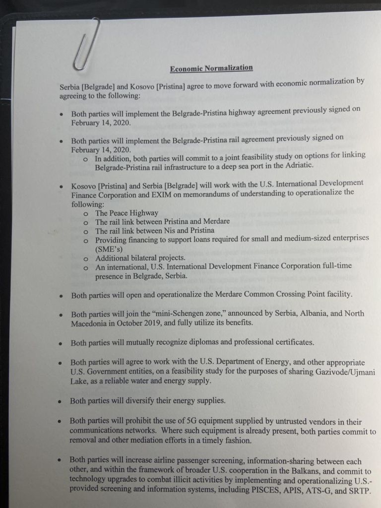 Më poshtë është dhe teksti i plotë i marrëveshjes, që ka karakter ekonomik, por edhe politik, pasi në pikën e fundit thuhet se Kosova do njihet nga Izraeli.