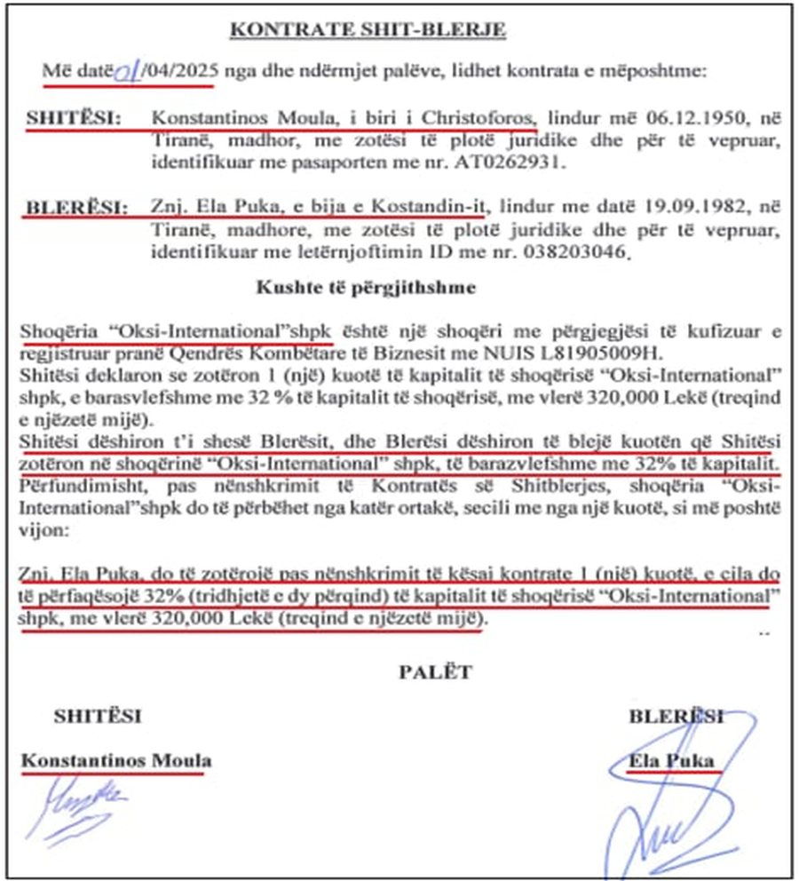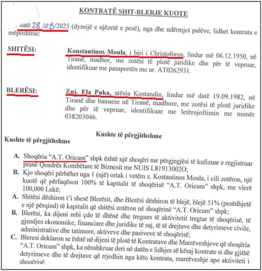 Nga dokumentet e Qendrës Kombëtare të Biznesit rezulton se Konstantinos Christoforos Moula, i lindur më 6 dhjetor 1950, dhe e bija Ela Kostandin Puka, e lindur më 19 shtator 1982, bashkëshortja e Endri Pukës, kanë qenë ortakë në kompaninë “Oxi International” dhe në resortin “Azar Luxury Hotel” në zonën e Ujit të Ftohtë në Vlorë, me vlerë investimi rreth 25 milionë euro. Më 28 gusht 2025, Moula ia ka shitur pjesën e tij Ela Pukës për vetëm 100 mijë lekë.