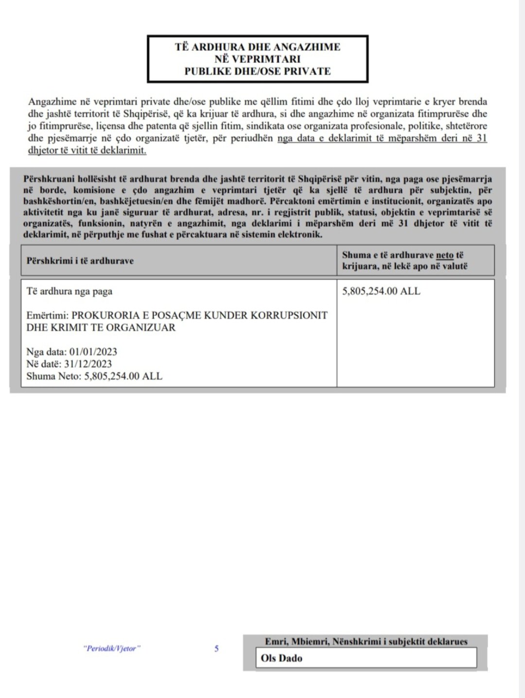 Ndërkaq, djali i vetëm i Ols Dados, Kris Dado, rezulton me pasaportë greke, me certifikatë lindje në Athinë dhe i pagëzuar nga një prift grek. Kur mbushi 18 vjeç, Ols Dado i bleu një makinë Range Rover të kuq, me vlerë mbi 35 mijë euro, por që e deklaroi 25 mijë euro. Pra, dhuratë 35 mijë euro me pagë modeste në Prokurorinë e Përgjithshme.