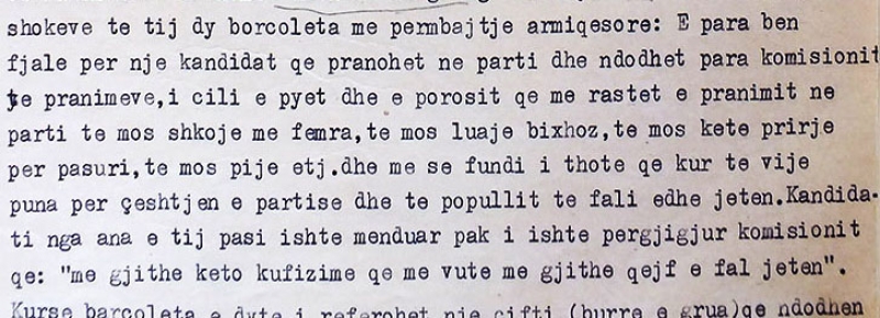 Një kandidat që pranohet në parti ndodhet para komisionit të pranimeve. Komisioni e pyet dhe e porosit që pas pranimit në parti të mos shkojë me femra, të mos luajë bixhoz, të mos ketë prirje për pasuri, të mos pijë, etj dhe në fund, për çështjen e partisë dhe të popullit të falë jetën. Kandidati pasi u mendua pak u përgjigj se me gjithë këto kufizime që i vunë, me gjithë qejf e falte jetën.