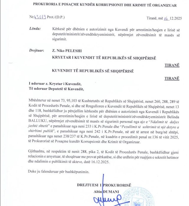 Mbështetur në nenet 73, 95,103 të Kushtetutës së Republikës së Shqipërisë, nenet 260, 288, 289 të Kodit të Procedurës Penale, si dhe në Rregulloren e Kuvendit të Republikës së Shqipërisë, nenet 13 dhe 118, bashkëlidhur ju përcjellim kërkesën për dhënien e autorizimit nga Kuvendi i Republikës së Shqipërisë, për arrestimin/heqjen e lirisë së deputetit/ministrit/zëvendëskryeministrit Belinda Balluku, nëpërmjet zëvendësimit të masës së sigurimit personal nga ajo e “Ndalimit të daljes jashtë shtetit” e parashikuar nga neni 233 i K.Pr.Penale dhe “Pezullimit të ushtrimit të një detyre a shërbimi publik”, e parashikuar nga neni 242 i K.Pr.Penale, në atë të arrest në burg/në shtëpi,