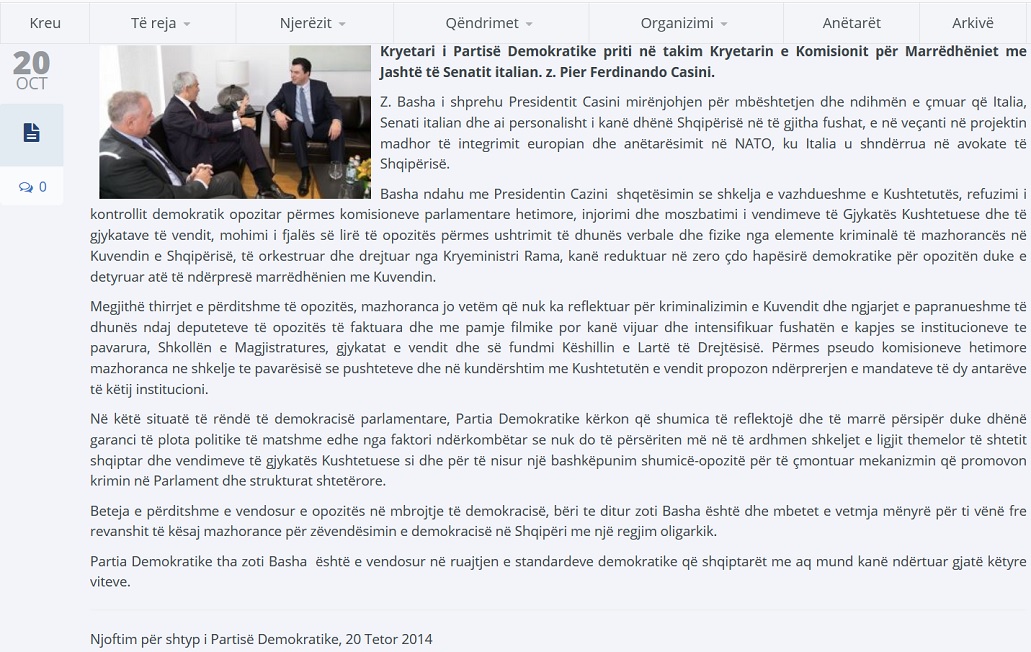 Sipas informacioneve të gazetës, Pier Ferdinando Casini është pritur nga Lulzim Basha në selinë e PD më 20 tetor 2014, kur mbante postin e Kryetarin të Komisionit për Marrëdhëniet me Jashtë të Senatit italian. Në këtë takim Basha shoqërohet nga Tritan Shehu.