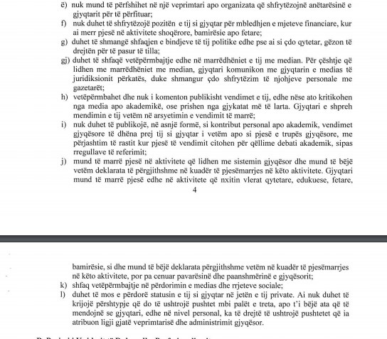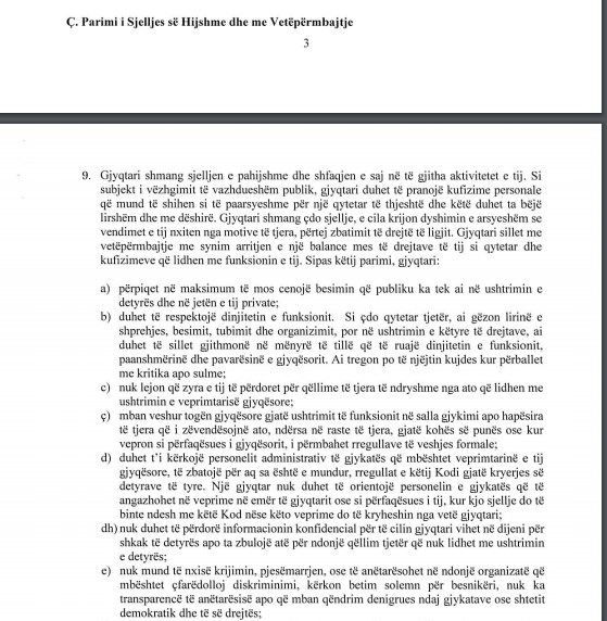 Pika ‘Ç’ i Kodit të Etikës tregon qartë të gjithë pikat e ‘parimeve të sjelljes së hijshme dhe me vetëpërmbajtje’. Por ajo që është ironike është fakti respektimi i Kodit të Etikës mbikëqyret nga vetë kryetarja e gjykatës.