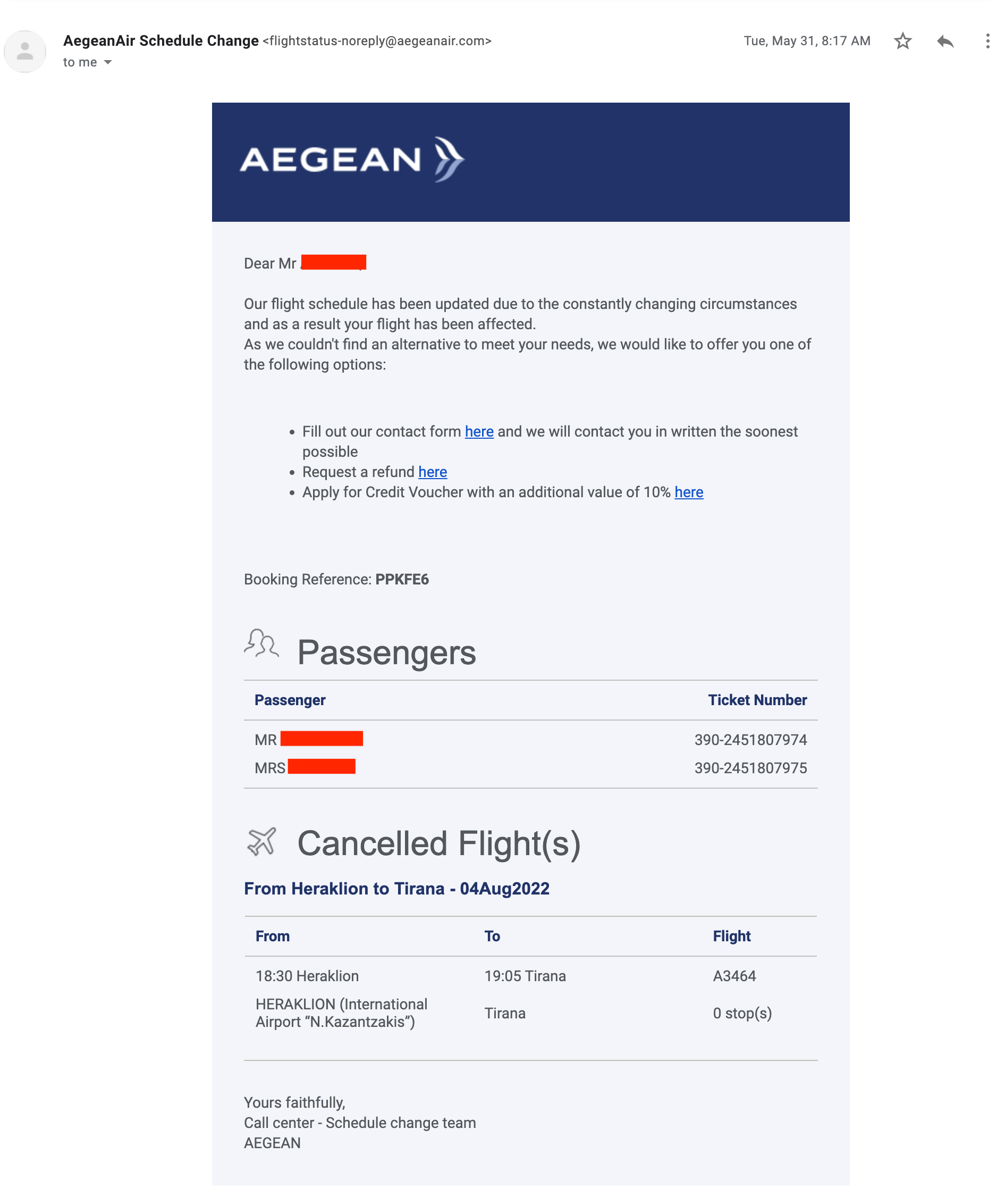 Nëse duan të shkojnë në ishullin grek, e vetmja mundësi për udhëtarët është të pronotojnë dy bileta të tjera me kosto shtesë rreth 100 euro (totali 547 euro), me një fluturim kthimi tranzit me Athinën, sërisht tek “Aegean”, një kompani që është e pasigurtë se mund t’ia anullojë biletat sërisht dhe ndërkohë i mban peng dhe paratë e biletave të para. T’ua kërkosh këtë një klienti që se ke rimbursuar akoma, është një çmenduri e vërtetë!