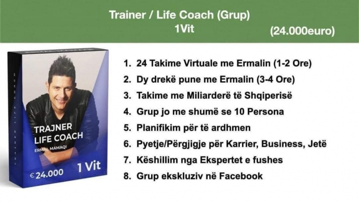 Eshte nje Pakete me trajnime nga me te ndryshmet dhe perbehet nga disa nga profesionistet e Shitjes, Marketigut, Meditimit dhe Vetezhvillimit. Dhe takimet me mua dhe Profesoret jane cdo jave.