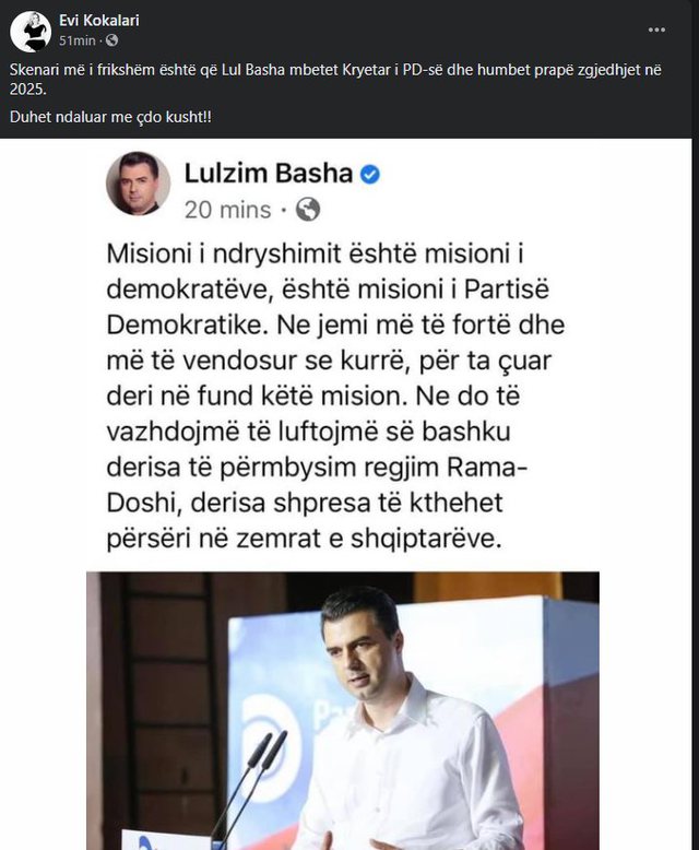 Sipas Kokalarit, nëse Basha vazhdon të qëndrojë në krye të PD, humbja është e sigurt edhe në vitin 2025, duke shtuar se kjo gjë duhet të ndalohet me çdo kusht.