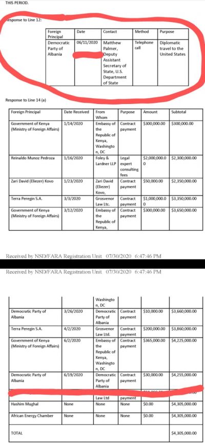Siç provon ky dokument, Partia Demokratike ka kërkuar përmes firmës së lobimit që të realizojë një telefonatë me Matthew Palmer, zëvendës ndihmës sekretar i shtetit amerikan me qëllim një vizitë në SHBA. Kërkesa e PD për të kontaktuar me Palmer regjistrohet në 11 Qershor të këtij viti, vetëm 6 ditë pas marrëveshjes së 5 qershorit për reformën zgjedhore në vend.