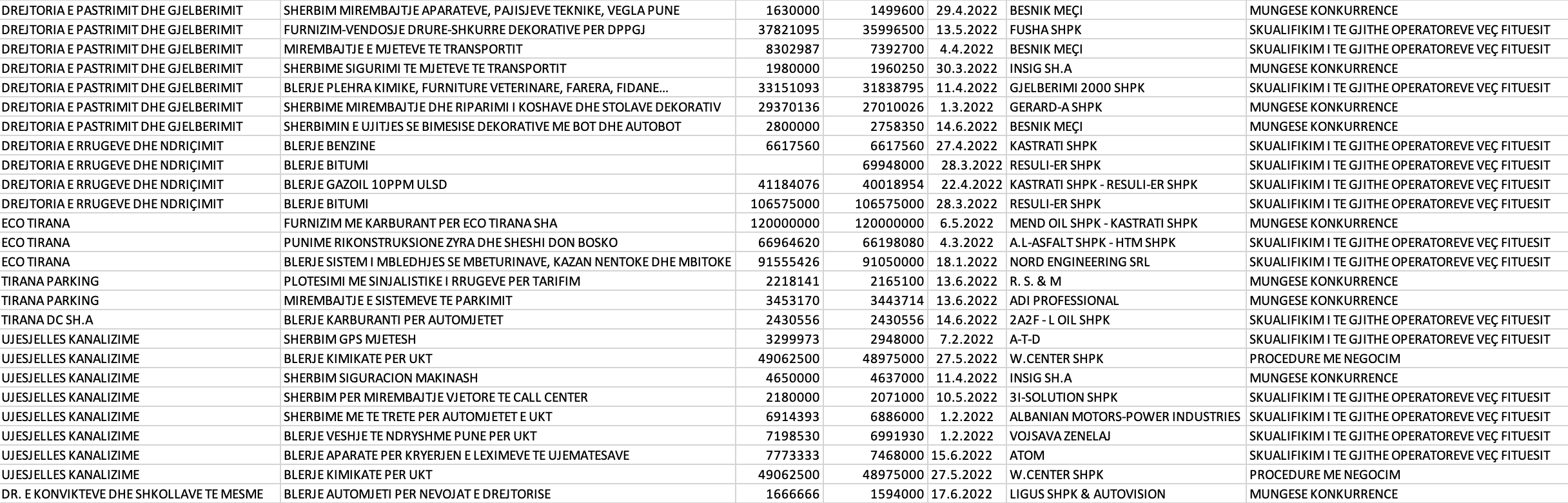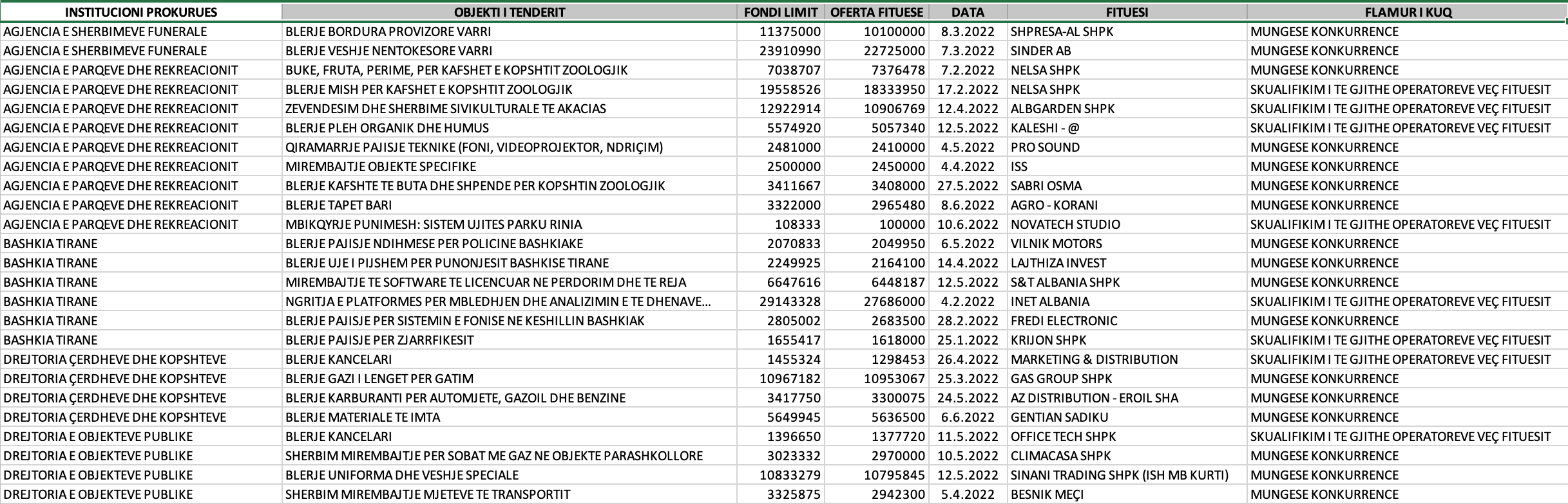 Në foto të gjitha tenderat e Bashkisë Tiranë, 52 tendera me flamur të kuq që kapin vlerën 8.1 milion dollarë vetëm për periudhën Janar-Qershor 2022