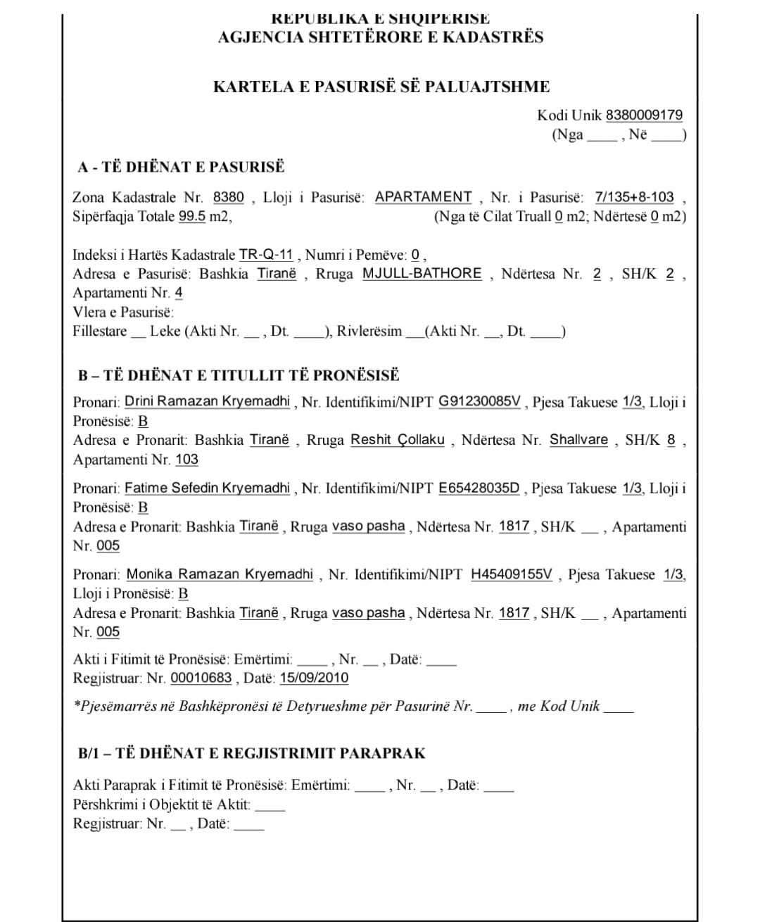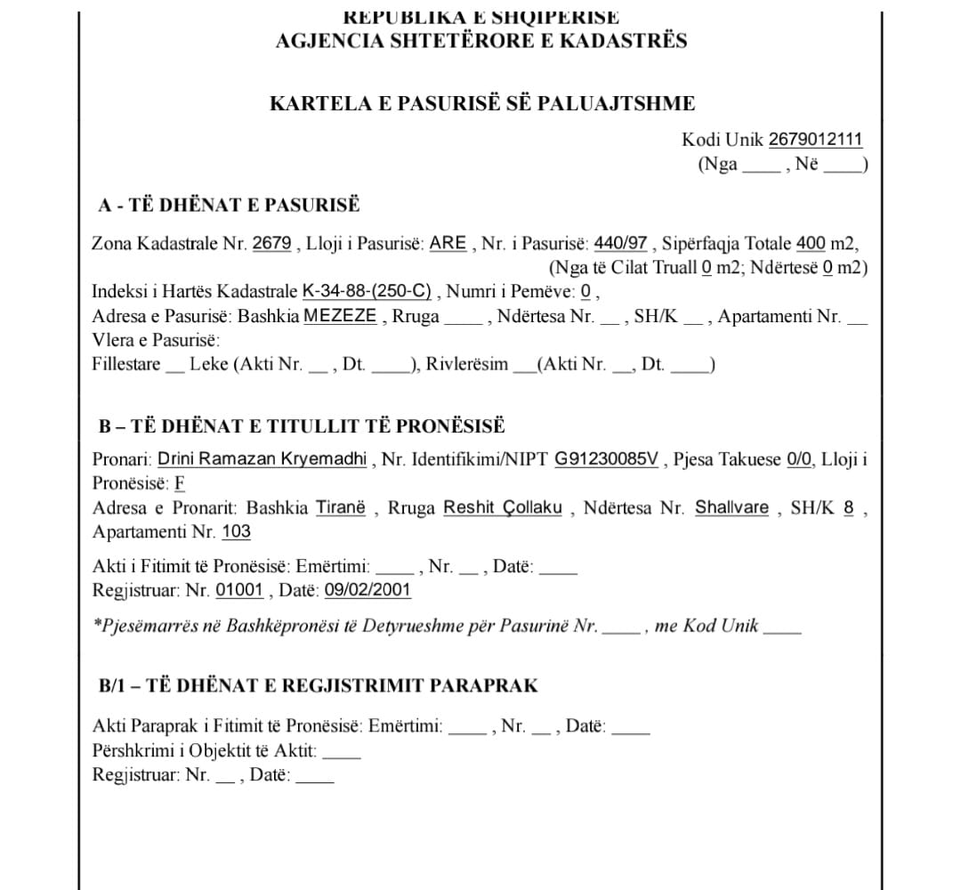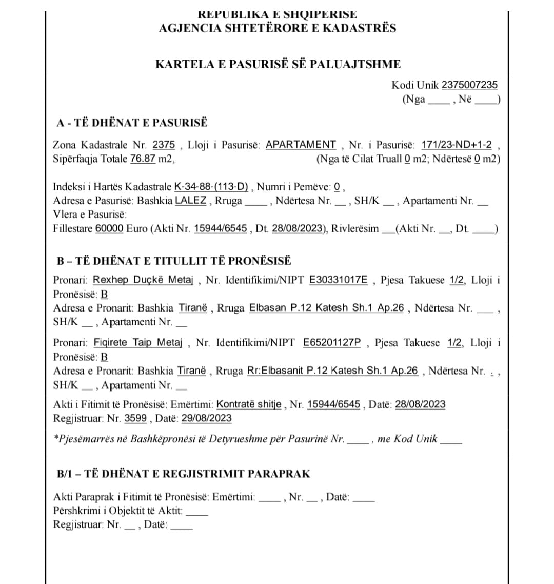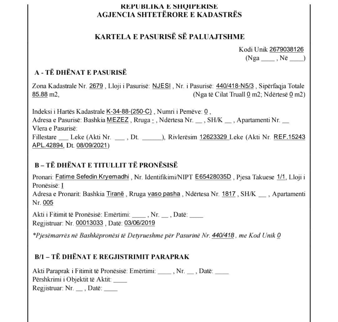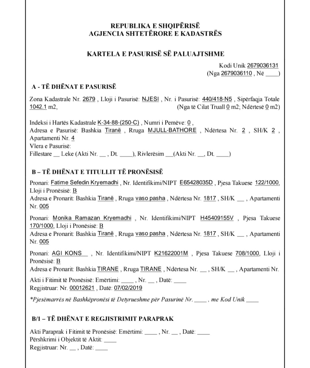 “Ilir Meta dhe Monika Kryemadhi kanë kamufluar një pasuri me vlerë miliona euro nga Sauku, zona përballë TEG, Rruga e Elbasanit, Mëzez deri në Gjirin e Lalzit, në emrin e Fatime Kryemadhit (nëna e Monikës), Drini Kryemadhi (vëllai i Monës), Rexhep Metaj (babai i Metës).