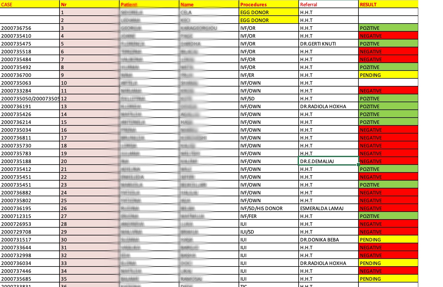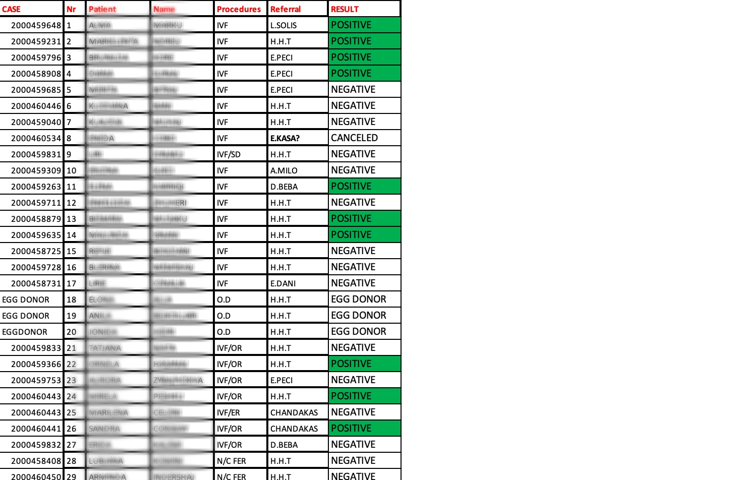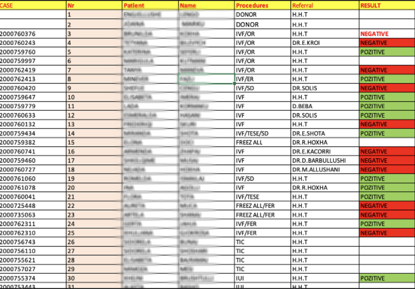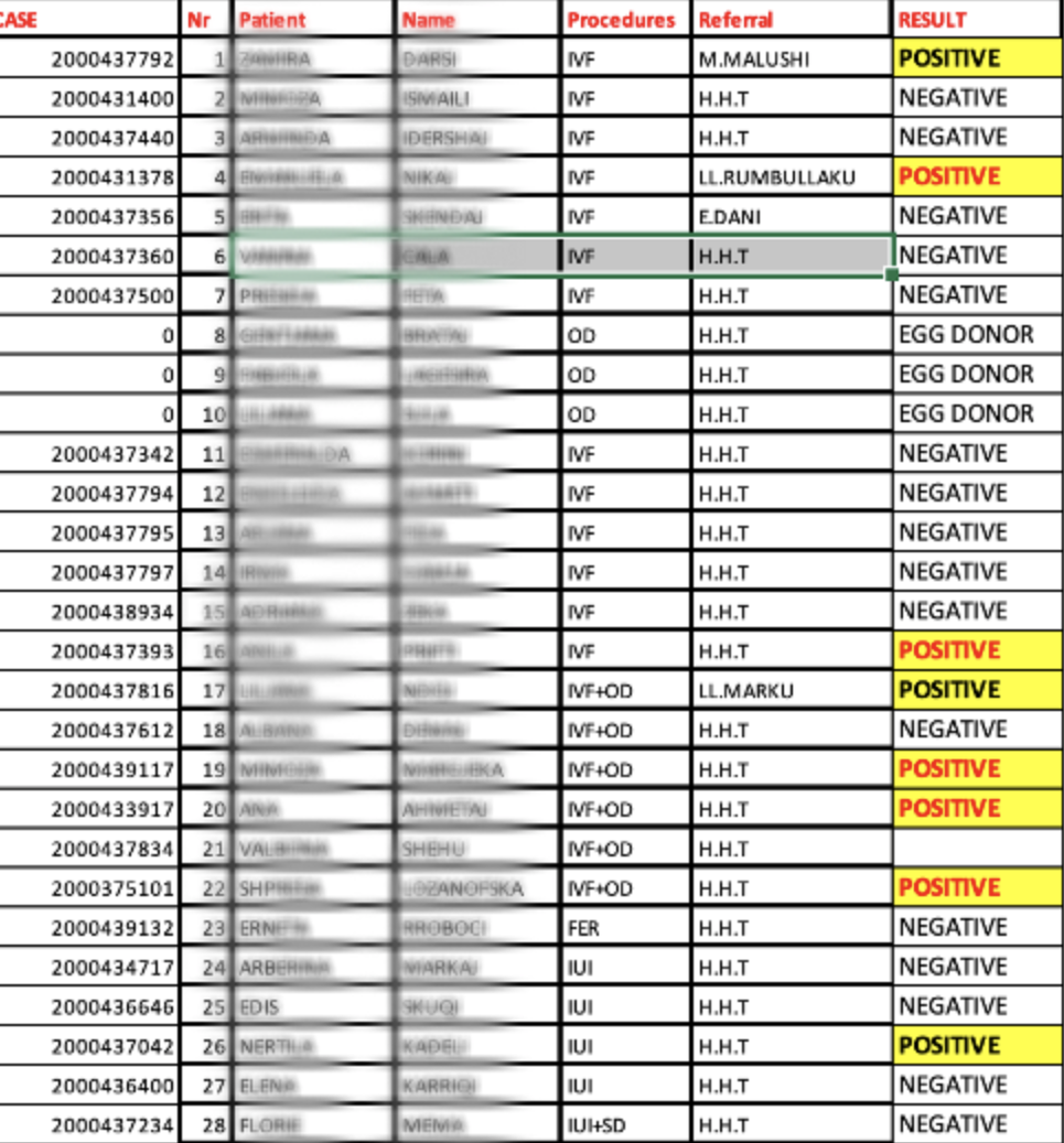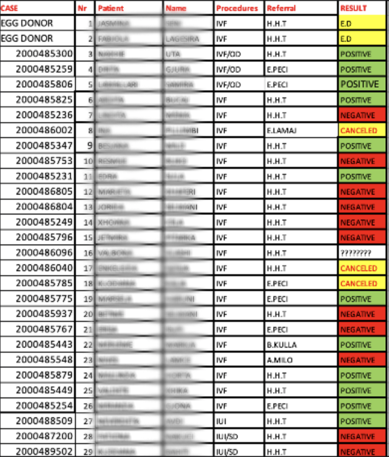 Në faksimile e siguruara nga ekskluzive.al, janë disa muaj në të cilën pasqyrohen regjistrat periodik të Klinikës së Fertilitetit pranë “Spitalit Hygeia”, ku fatkeqësisht nuk kanë mundur të ngelin shtatëzanë mbi 50% përqind të grave që i janë nënshtruar procedurës. Spitali gënjen kur thotë se procedurat e saj janë 75% të sakta, ku dokumentat flasin të kundërtën dhe këtë spitali e di shumë mirë pasi i ka të njëjta të dhëna, sikurse janë paraqitur prej nesh.