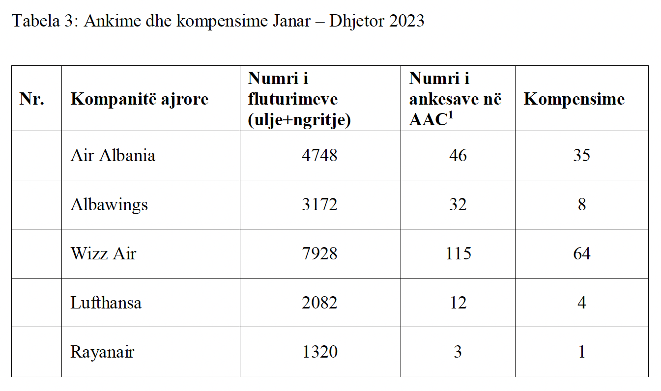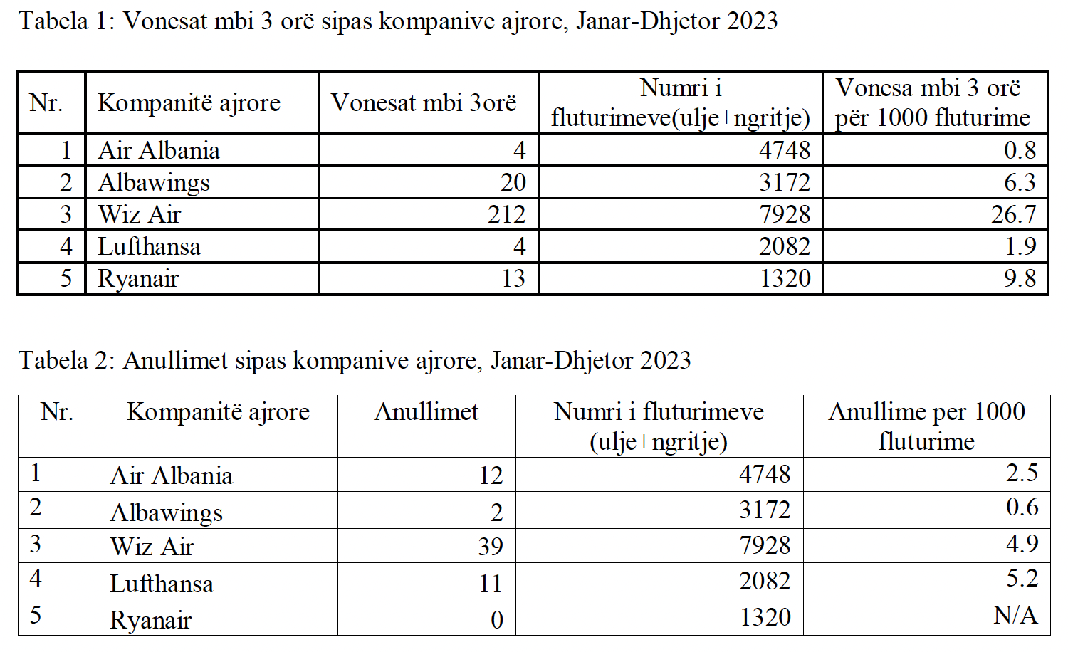 Nga burimet zyrtare të AAC, rezulton se Wizz Air është kompania që ka numrin më të madh të vonesave mbi 3 orë dhe anullimeve përgjatë vitit 2023, me një koeficent 26.7 për 1 mijë fluturime, e pasuar nga një koeificent 3-4 herë më të ulët të Ryanair me 9.8 dhe Albawings me 6.3. Ndërsa kompania ajrore Air Albania 0.8 dhe Lufthansa 1.9 kanë koeficentin më të ulët sa i përket vonesave mbi 3 orë (shih tabelën mëposhtë).