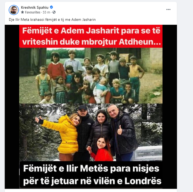 “Dje Ilir Meta krahasoi fëmijët e tij me Adem Jasharin”, shkruan Spahiu teksa ka publikuar dy foto që transmetojnë 2 realitete krejt të ndryshme.