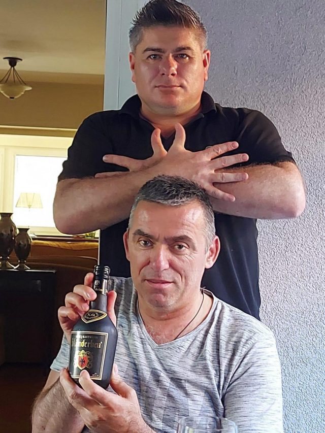 Ai shfaqet në foto duke bërë shqiponjën dhe prezantuar shishen e rakisë “Skënderbeu”. Në këtë formë ai ka përshëndetur serbët, për të cilët thotë se e kërcënuan ditët e fundit.