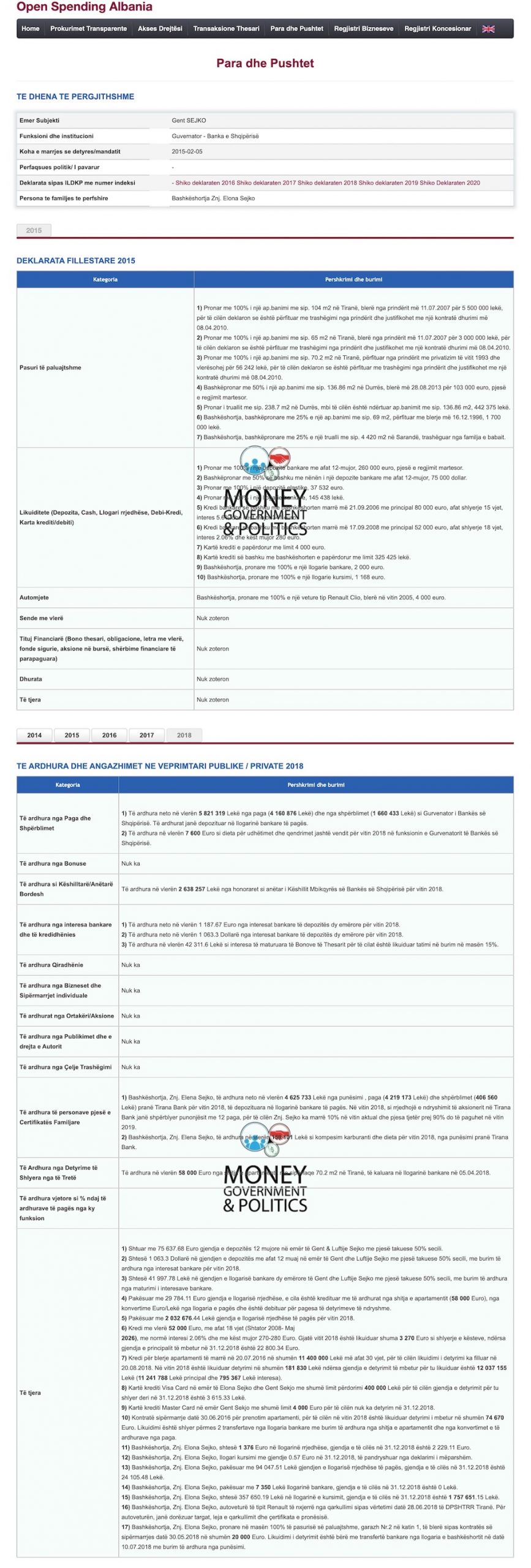 Për ta kuptuar më mirë skemën, Gent dhe Elona Sejko (që e ka regjistruar vilën në mbiemrin e vajzërisë), blenë vilën 60/1 në Green Coast me vlerë 250 mijë euro dhe me një mobilim 200 mijë euro. Pra vlera e mobilimit të vilës shkonte pothuajse sa vlera totale e pronës. Vila 2 vjet më vonë papritur kap vlerën e 1.2 milion euro, jo vetëm për guvernatorin por kryesisht për të gjithë pronarët e vilave të kompleksit luksoz që e blenë “me të lirë”. Por asgjë nga këto nuk është e shkruar në deklaratën e pasurisë (Shih foto në fund të artikullit).
