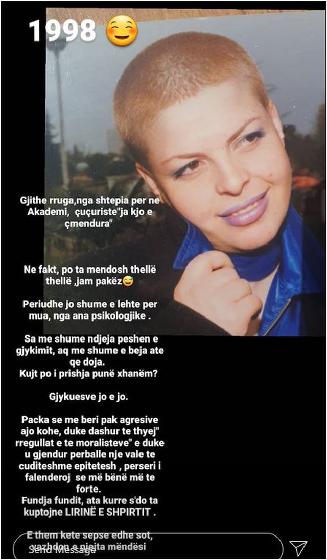 Fundja fundit, ata kurrë s’do ta kuptojnë Lirinë e Shpirtit. E them këtë sepse edhe sot vazhdon e njëjta mendësi”, shkruan ajo në Instastory.