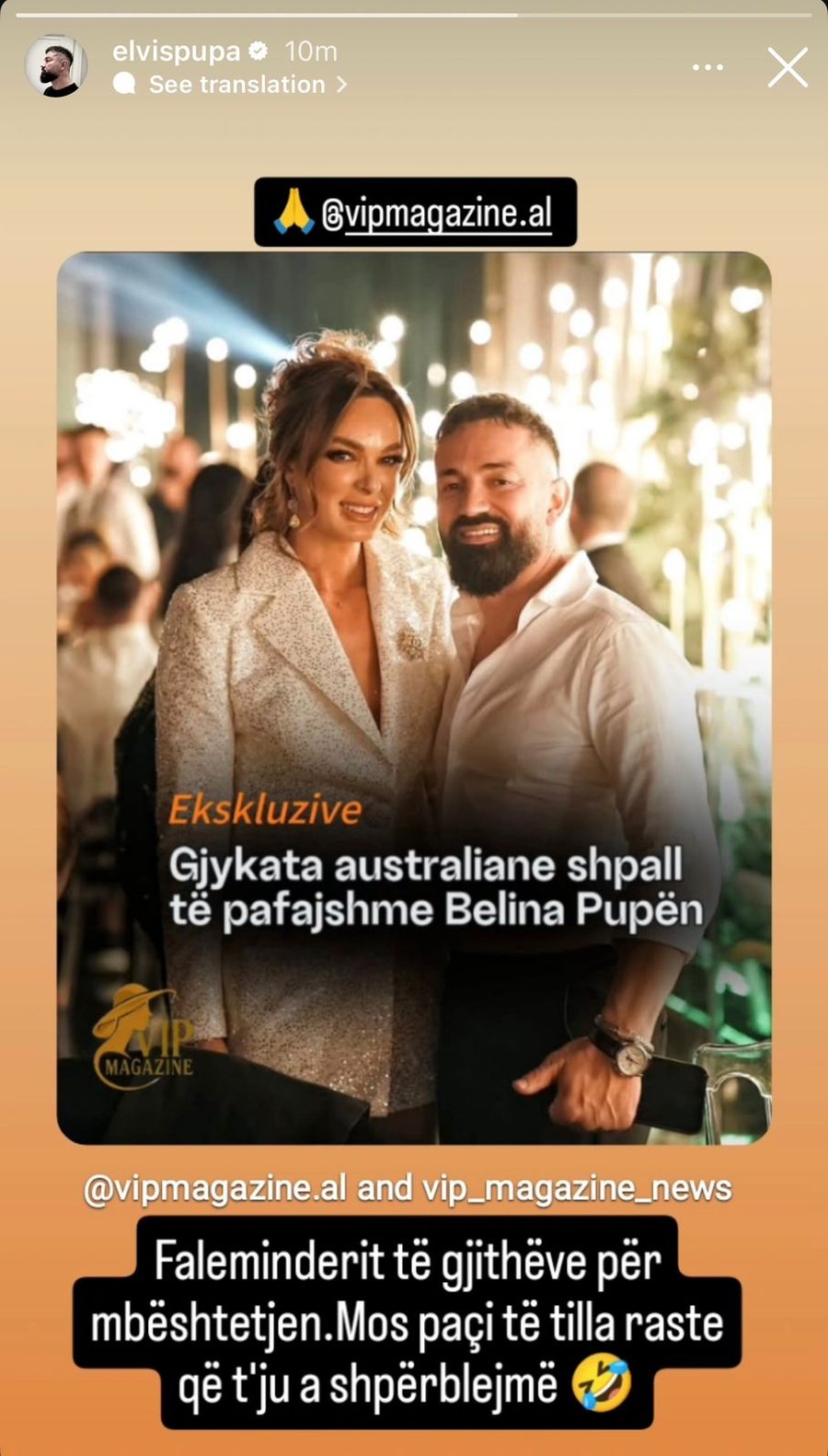 Gjithashtu, bashkëshorti i influencueses, aktori i humorit, Elvis Pupa, ka ripostuar lajmin në Instagramin e tij dhe shkruan: