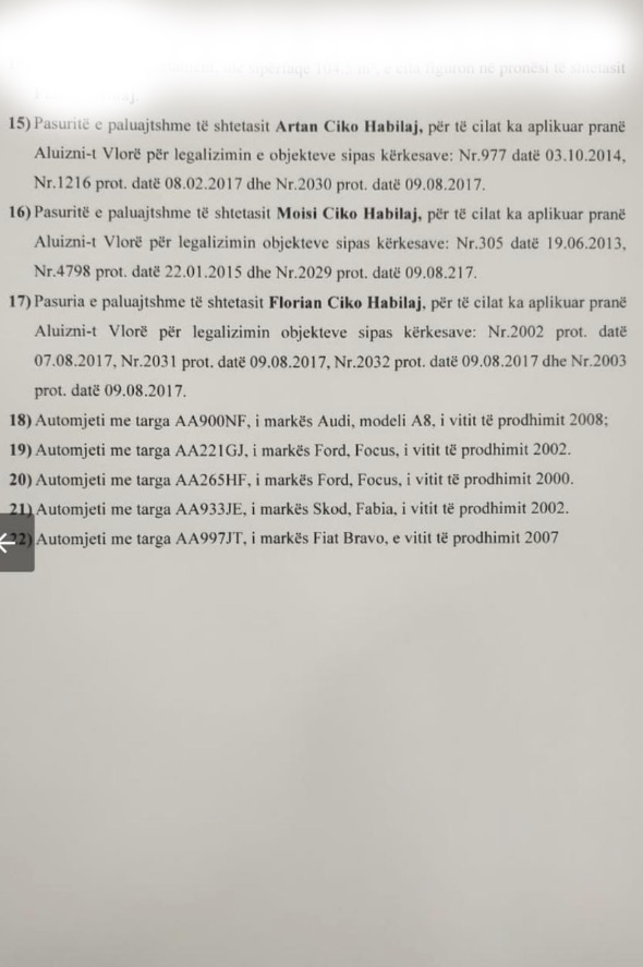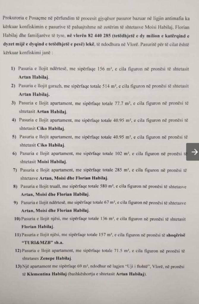 Gjykata e Posaçme e Shkallës së Parë për Korrupsionin dhe Krimin e Organizuar ka konfiskuar pasuritë e Moisi Habilajt dhe familjarëve të tij.