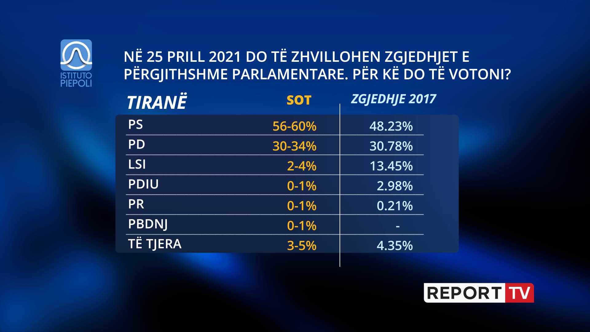 Sondazhi i zhvilluar nga Report tv dhe Instituti prestigjioz italian Piepoli, i transmetuar gjatë emisionit “Repolitix” nxjerr Partinë Socialiste shumicë në zgjedhjet e 25 prillit. Partia Demokratike është në rritje krahasuar me vitin 2017, ndërsa votat e LSI-së i shkojnë Partisë Socialiste.
