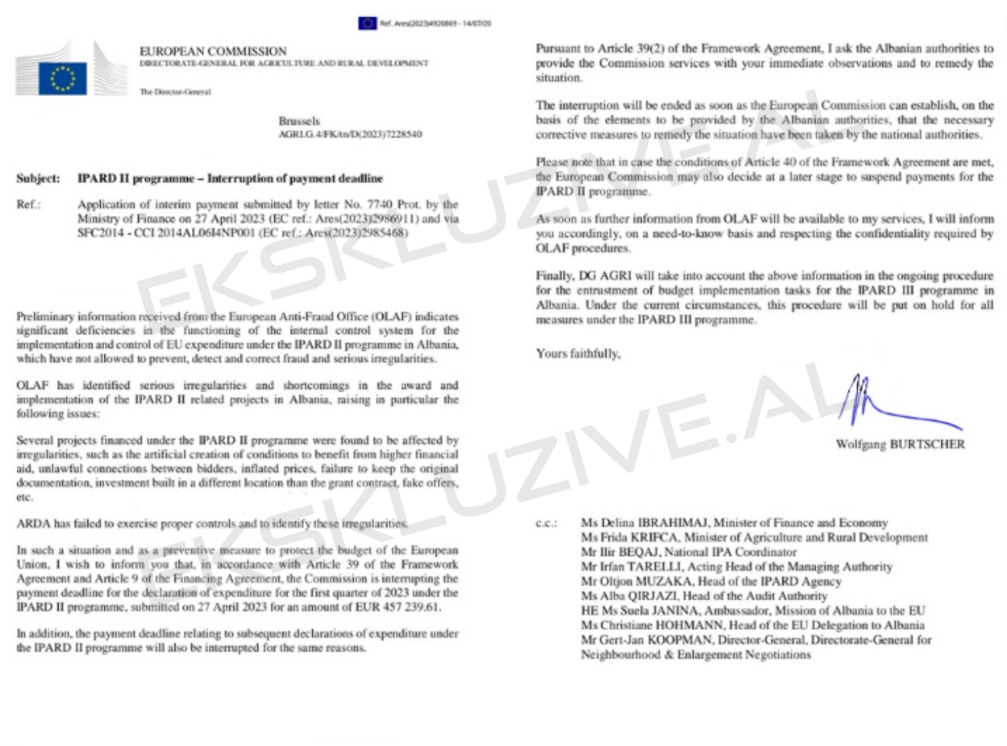 Në korrik të vitit 2023, Komisioni Europian ndërpret fondet për Shqipërinë, që u përdorën për mbështetjen financiare të projekteve në bujqësi, ndërsa Delegacioni i Bashkimit Europian në Tiranë, sqaroi se kjo masë është marrë në kuadër të një hetimi të nisur nga Brukseli, pas akuzave për korrupsion me fondet për bujqësinë të programit IPARD 2. Paralel me këtë deklaratë reagoi edhe Ministria e Bujqësisë e drejtuar asokohe nga Frida Krifca, e cila u shpreh se: “…programi është ndërprerë përkohësisht dhe se procedura hetimore është normale”. Muaj më pas, ministrja Frida Krifca shkarkohet nga detyra për shkak të nisjes së hetimit nga SPAK dhe raportit që ka depozituar Zyra Europiane Kundër Mashtrimit (OLAF), lidhur me vjedhjen dhe abuzimin e mbi 100 milionë euro fonde që dha BE për fermerët e Shqipërisë.