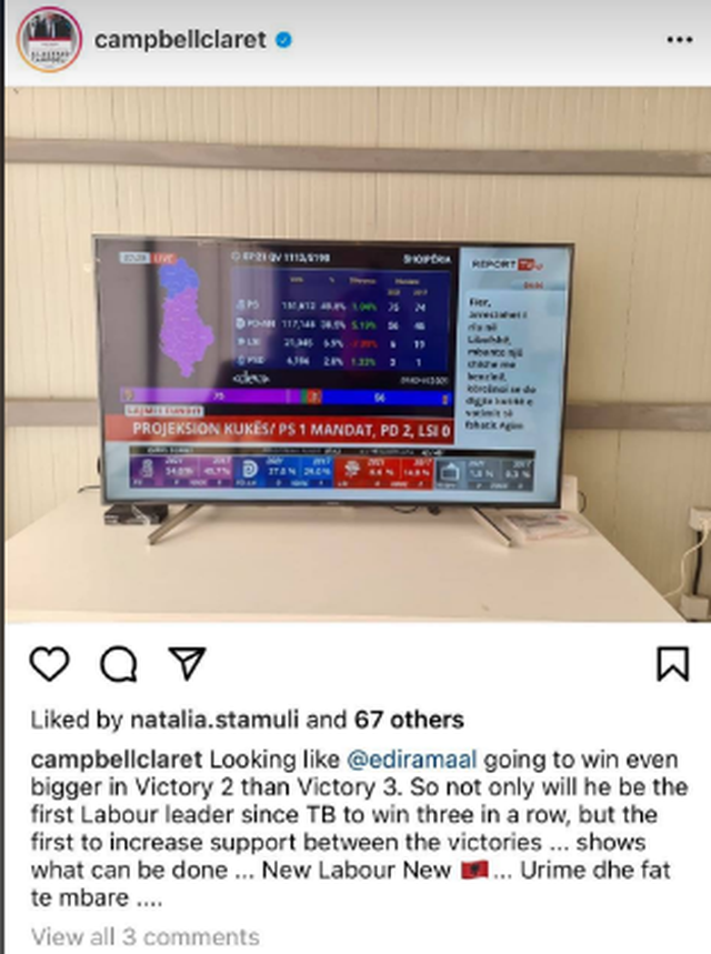 Nëpërmjet një postimi në Instagram, Campbell thekson se Rama po shkon drejt një fitoreje të tretë edhe më e madhe se e dyta, referuar rezultatit të PS në zgjedhjet e vitit 2017.