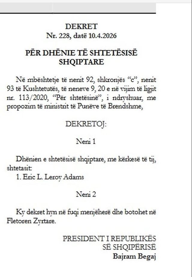 Në dekret thuhet se Adams u pajis me pasaportë shqiptare me kërkesë të tij vetë.