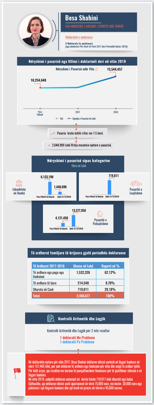 Përveç analizës për rritjen/uljen e pasurisë, strukturën e aseteve dhe të ardhurave, ky raport paraqet dhe kontrollin aritmetik/logjik të deklarimeve të subjektit si dhe “flamujt e kuq’ që identifikohen gjatë kontrollit. BIRN kreu kontrollin aritmetik/logjik për 2 vite të deklarimit, njëra prej të cilave rezultoi me probleme.