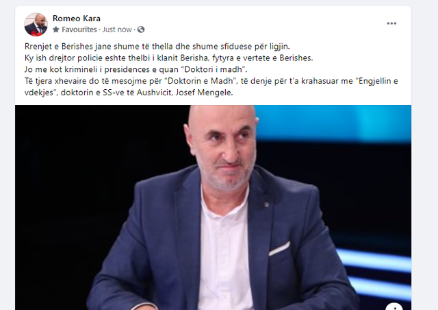 Përmes një postimi në rrjetet sociale, Romeo Kara shkruan se rrënjët e Berishës janë shumë më të thella dhe pikërisht ky ish-drejtor policie është thelbi i klanit të Berishës.