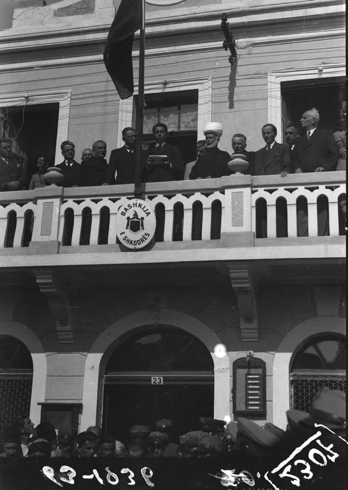 ( Fotot me poshte jane ne ballkonin e Bashkise se Shkoder. E.Hoxha heq pjesëmarrësit, duke filluar nga Gjergj Fishta).