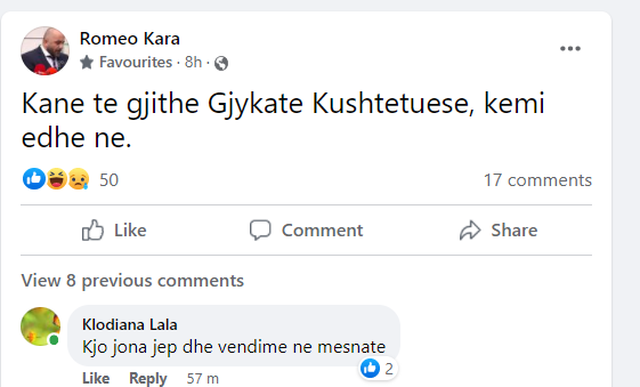 Pikërisht në këtë postim të juristit Romeo Kara ka ardhur një koment epik edhe nga gazetarja Klodiana Lala, nisur nga ora e vonë e natës kur u vendos të bëhej publik ky vendim.
